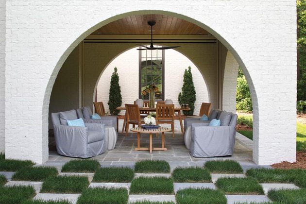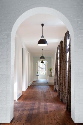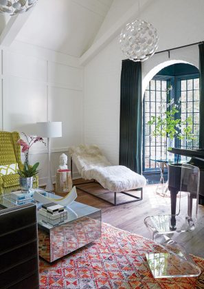 The arrangement preserves mature trees, providing a feeling of permanence, and opens up to views to the golf course. With equally enthusiastic and adventurous aspirations for the interiors, the client turned to Paige Schnell and Anna Kay Porch of Tracery, a firm based in Rosemary Beach, Florida. “I had admired their work from magazines and books, and I recommended them,” Kirby says.