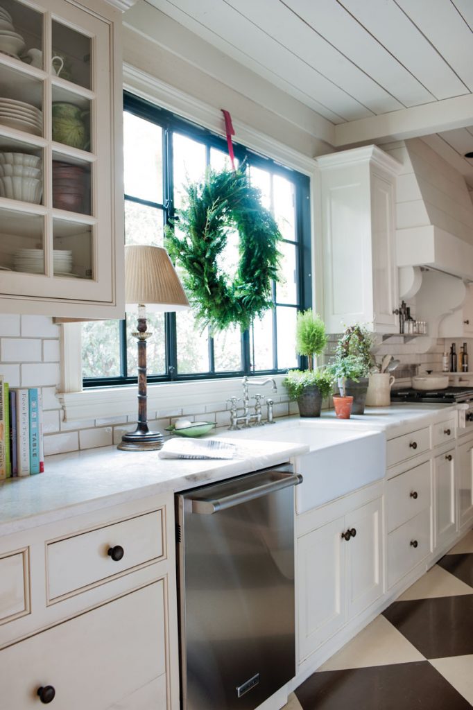 Keeping the needs of her family of four in mind, Beth created a year-round house that easily lends itself to both entertaining and daily life. The kitchen is anchored by hand-painted checkerboard-patterned floors and accented by her favorite collection of green-glazed French pottery. Sumptuously appointed bedrooms are plush with dressmaker details in her favorite designer fabrics (Rose Tarlow, Colefax and Fowler), and public spaces are awash in Benjamin Moore’s Carrington Beige. The result is a timeless, pleasing backdrop that, come Christmastime, calls for little more than fresh botanicals to accessorize.