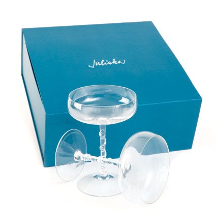 From the Bohemian mouth-blown collection which features an iconic spiral on the stem accented with the signature berry. Boxed set of 2; $135; juliska.com