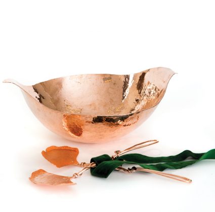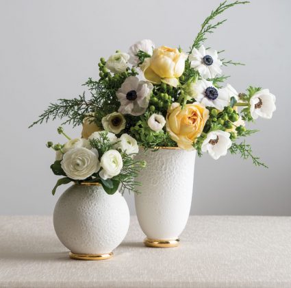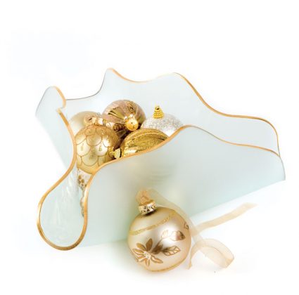 Frosted glass with a 24kt. gold edge: Vase is also food-safe; Approximate size: 15”W x 14”D x 7”H; $263; annieglass.com