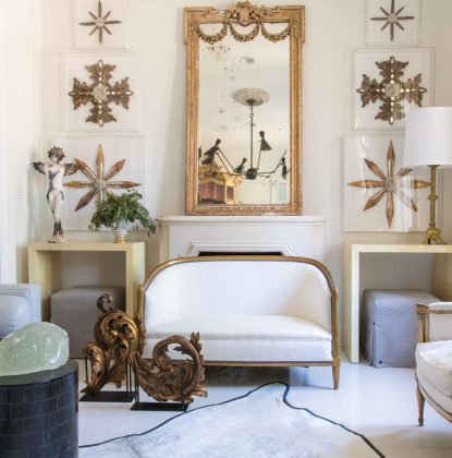 Composed of 17th- to 19th-century fragments, semi-precious geodes, and selenite mounted on canvas and framed in a signature Lucite frame. $475 to $900; nancypriceinteriors.com