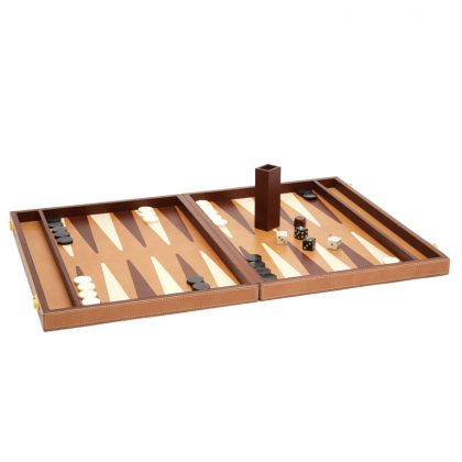 Playing board fashioned from full-grain leather, a hair-on-hide box, and playing pieces made from bone and horn. Small: 11.5”W x 7.5”D x 2”H, $400; larger size available; pigeonandpooodle.com