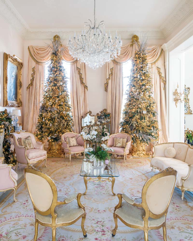 The dining room pays homage to the announcement of Christ’s birth with a pair of trees bearing topiary angels with trumpets. A Waterford chandelier shines down upon a dining table surrounded by 12 Louis XV side chairs from the William Randolph Hearst estate. An antique Aubusson rug anchors the setting. In the family room, the decorations take a fanciful turn, playing to the childlike wonder associated with the season. A 4-foot nutcracker, pink toe shoes, and a tutu from a performance of The Nutcracker add seasonal whimsy to the water-gilded Louis XV and XVI furnishings dressed in Scalamandré and Fortuny fabrics. Rock candy, peppermints, and other edible goodies can be plucked from a dish or straight from the tree.