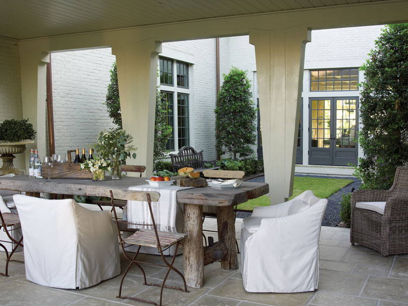 McAlpine set to work creating a U-shaped design with porches that flank the front of the home and an enclosed courtyard with a pool and dining areas. Situated to provide stunning lake views, the European-inspired cottage includes expansive windows and a steep, rolling roofline reminiscent of a gentleman’s brimmed hat. “The roof is romantic, and the house is very approachable,” says Spearman. “The front door is a side door, which creates a casual welcome as you walk in.”