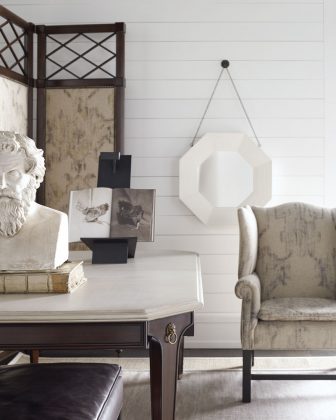 Octagonal mirror featuring a wood frame in white lacquer with chain and hook; $1,860; mr.bakerfurniture.com