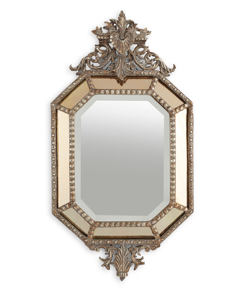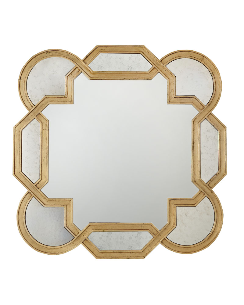 Wood mirror with antique gold leaf finish and decoratively shaped border with insets of antiqued mirror glass; $950; bernhardt.com