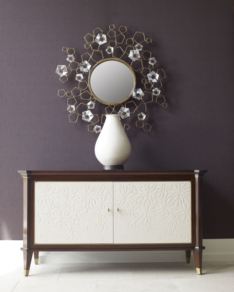 A dramatic mirror inspired by cherry blossoms features 18 lead crystal blossoms; $9,600; bakerfurniture.com