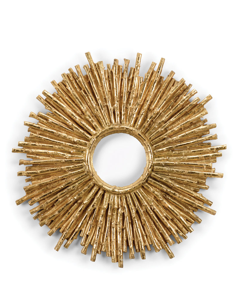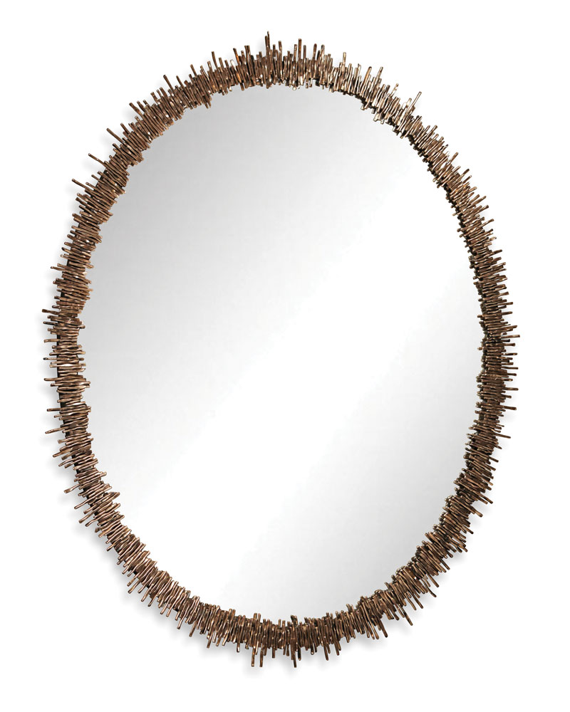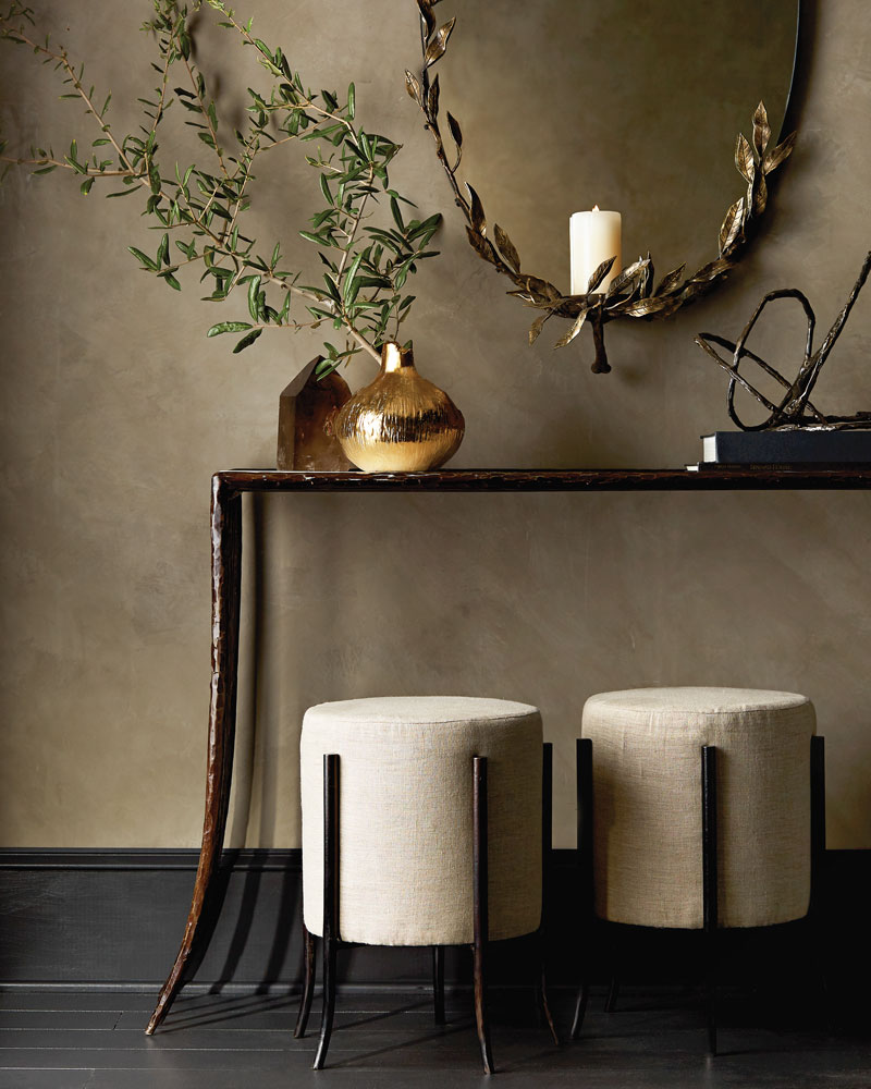 Elegant ovoid mirror is held in place by an organic cluster of antique brass leafy branches. A small ledge at the mirror’s base is perfect for a scented candle, figurine, or objet d’art; $2,895; arteriorshome.com