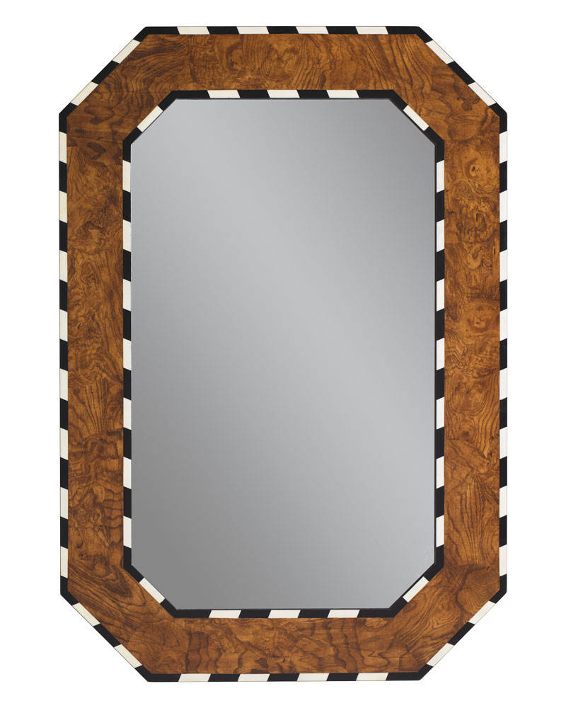Octagonal-shaped mirror with decorative burlwood veneer bordered by ebony; $1,400; bunnywilliamshome.com