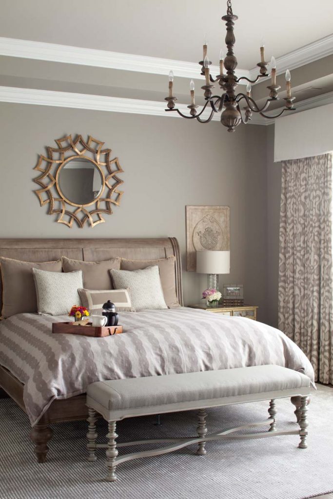 The homeowners desired a master suite that was elegant and serene, complete with a sitting area and a neutral palette. Custom draperies let in just the right amount of light, and layers of textured bedding, a mirrored side table, and a bronze chandelier add class. In the bath, a backsplash composed of glass tiles offers a shimmer to the room, while tall, mirrored cabinets contain hidden power outlets, plus plenty of precious storage for linens and other hideaways.