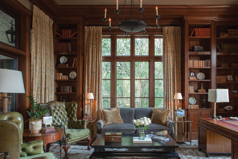Clearly rooted in classical traditions, the 5,800-square-foot house defers to the principles of Renaissance architect Andrea Palladio, while the grand portico nods to London’s St. Paul’s Church at Covent Garden designed by Inigo Jones in 1631. True to form, the home reveals itself in stages, starting with a brick-lined drive that leads to the arrival forecourt. A barrel-tile roof, cast-stone windows, tall arched doorway, timber eaves, and large planters enhance the front elevation’s unerring interpretation of timeless traditions. From there, the Tuscan-ordered entry portico welcomes guests into the gracious interiors.