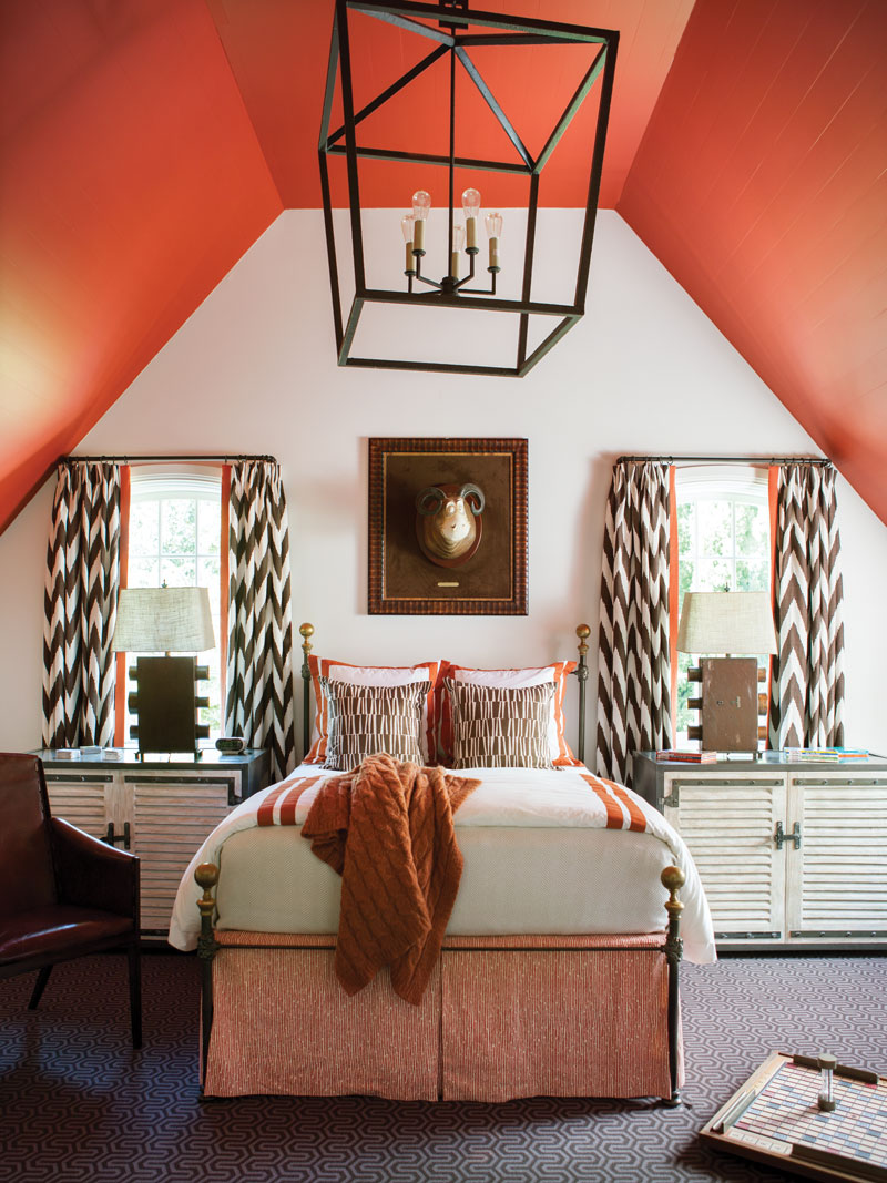 The main level’s muted undertones give way to bolder palettes upstairs, creating a more whimsical look in the three children’s bedrooms. Color combinations, including chocolate and orange, eggplant and sunny yellow, and emerald and ocean blue, define the rooms, giving each one an identity and personality all its own. Similarly, the lavender guest bedroom—which opens to a bunkroom with three twin beds—feels like a playful escape thanks to a striped paint treatment that extends to the ceiling. “The ceiling comes to a point, so it was quite the math equation to figure out the width of each stripe in order to make them appear all the same to the eye,” Morris says. “I love how cozy this room turned out.”