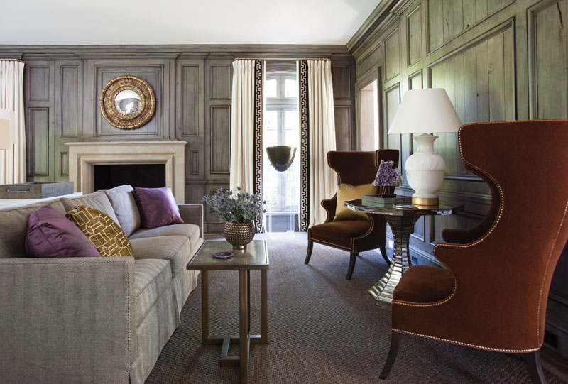 Aside from scale, color is in abundance but not overwhelming. “The homeowner loves color but didn’t want it in your face, especially on the main floor,” Morris says. To achieve this balance in the entry hall and adjacent dining room, the designer used a range of purples from lavender to plum. The result is a space that reads as a neutral yet fits well in a home filled with pops of color throughout its footprint. A prime example is the eggplant-hued range that takes center stage in the predominantly white kitchen.