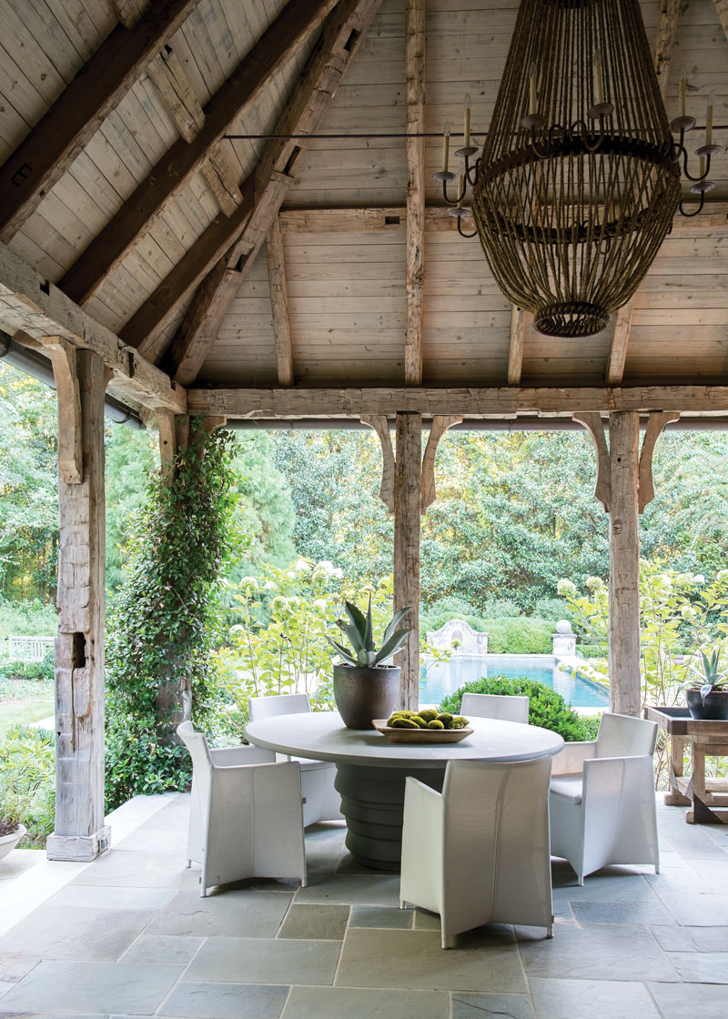 Additionally, a blend of textures brings a refined layer to the overall design, as seen in the foyer where a Phillip Jeffries wall covering gives warmth to the spacious entry hall. In the family room, wooden beams and a textured diamond rug are softened with a number of rich, luxurious fabrics, including velvet, which also appears in a number of other rooms to add an overall cohesiveness. Because the family has young children, many durable, easy-to-clean fabrics were used, especially in high-traffic areas and frequently used spaces. The breakfast nook—a favorite area for snacks and homework—features a leather bench and chairs that are covered in outdoor fabric to stand up to the test of little hands.