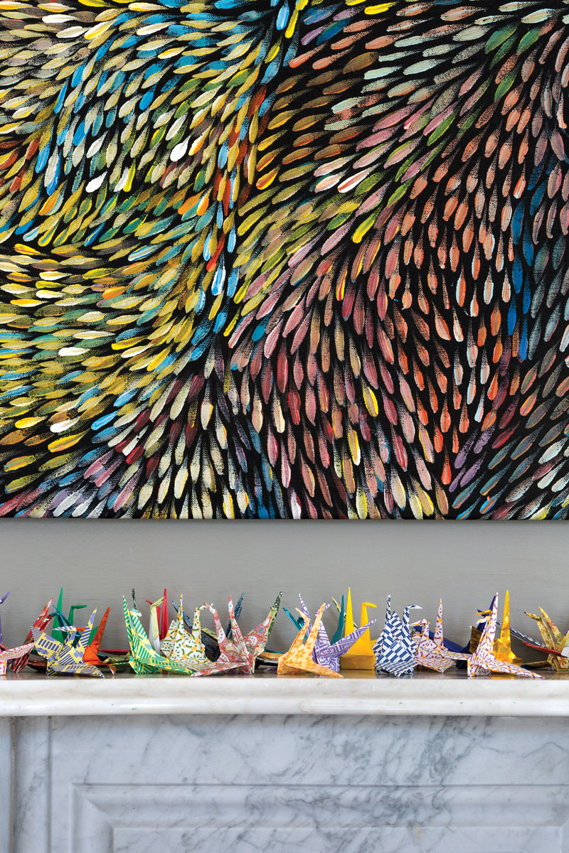 The homeowner wanted a modern dining room, so Mitchell and Hill chose an iconic Saarinen tulip table with nearly indestructible Italian-made Lucite chairs surrounding it. The metal cabinet in the back was a bit of a sticking point for its utilitarian design. “I was hesitant at first,” Mitchell admits about the makeshift sideboard. However, once it was installed and accented with funky lamps, objets d’art, and another of the owner’s abstract canvases, the ultra-functional piece fit right in.