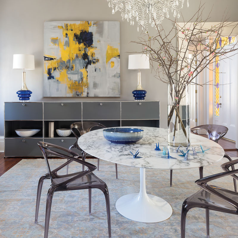 The homeowner moved to Charleston without much in the way of possessions—mainly her books, wardrobe, personal effects, the contents of her studio, and a small haul of treasured artwork, including a painting made by Aboriginal women (which hangs above the living room fireplace). She also had a few precious pieces of Japanese pottery.