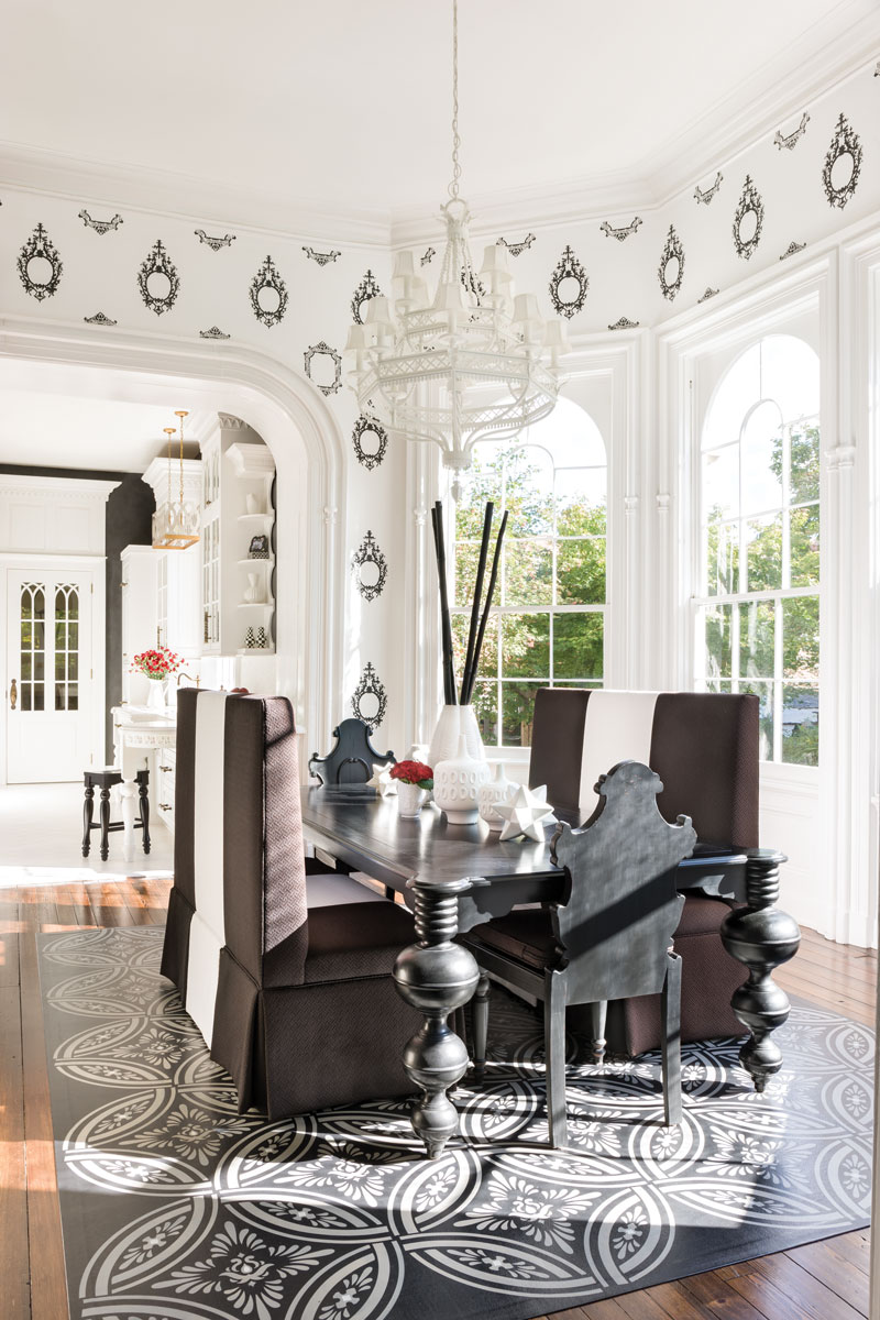 For intimate gatherings, a small breakfast room off the kitchen includes upholstered benches that lend a casual vibe. The formal dining room, with its original, carved marble mantel and elaborate moldings, suits more formal occasions with a round table that encourages the flow of traffic for big holiday parties.