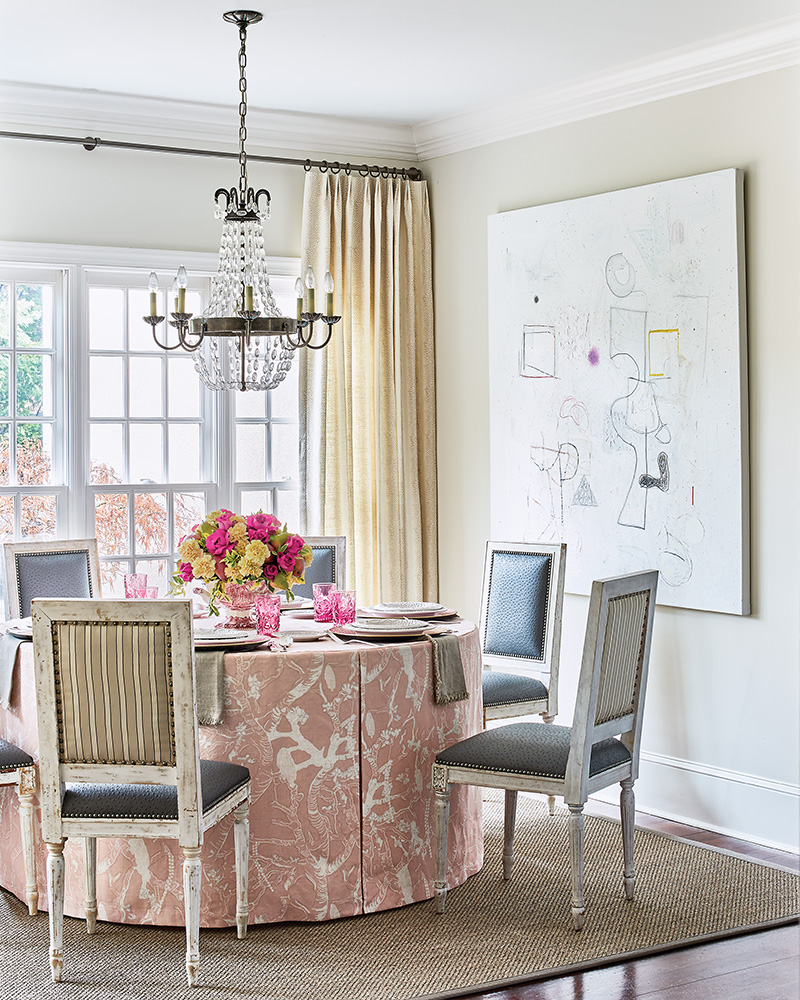 The sunny breakfast room features a 60-inch round custom tablecloth that uses fabric from textile designer Isobel Mills. Zeller says her love of the fabric and its color and texture was instrumental in bringing her Christmas designs together.