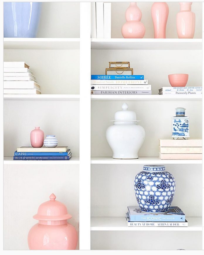 An assortment of objects in varied shapes and sizes adds interest and pizzazz to otherwise plain white shelves without making them feel cluttered.