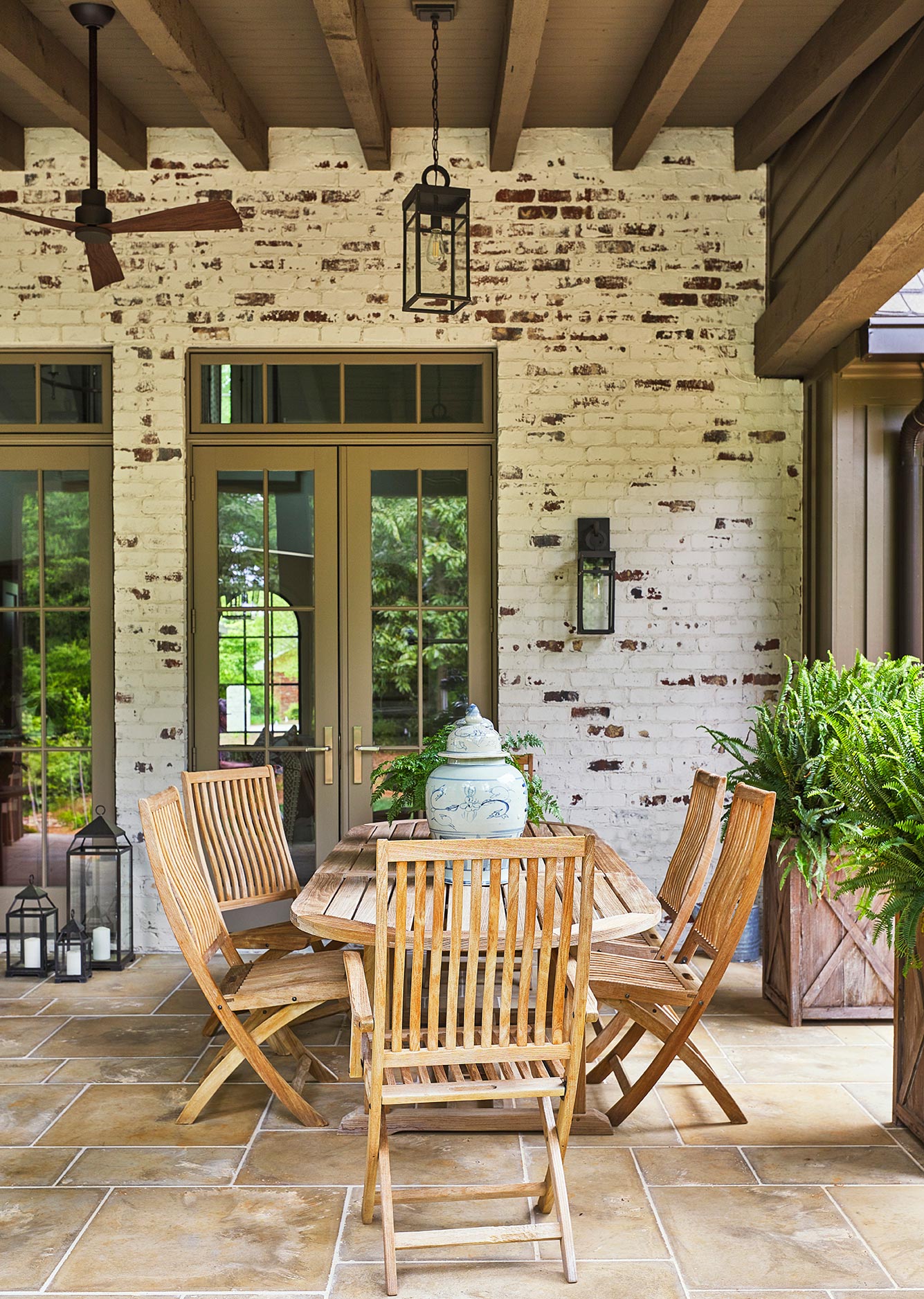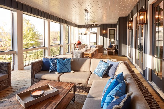 Consider one’s porch as an extension of the main living spaces, with ample room for family and friends to sit among several comfy chairs or rockers, a deep sofa with fluffy cushions, and a pair of outdoor lamps to give both ambiance and reading light.