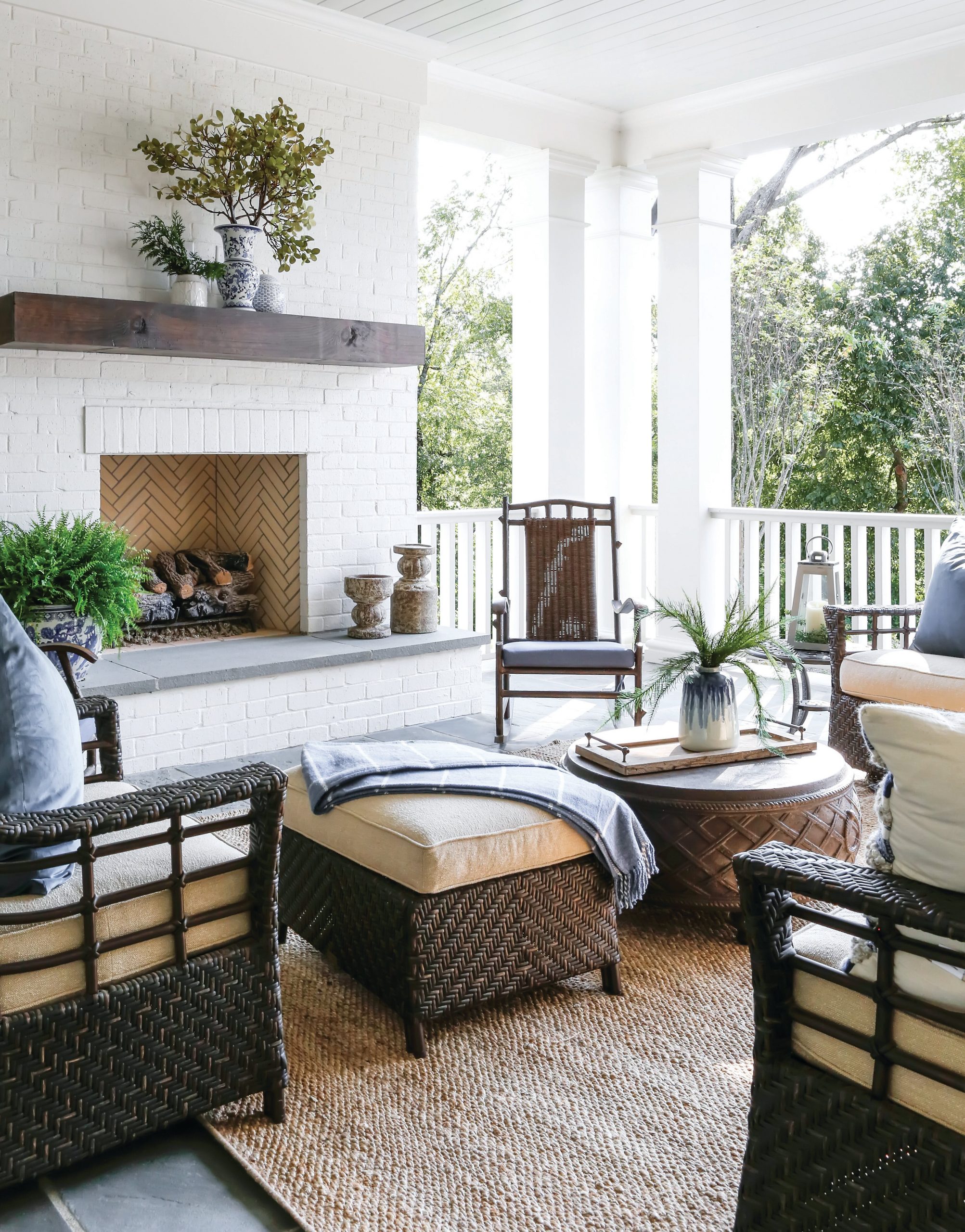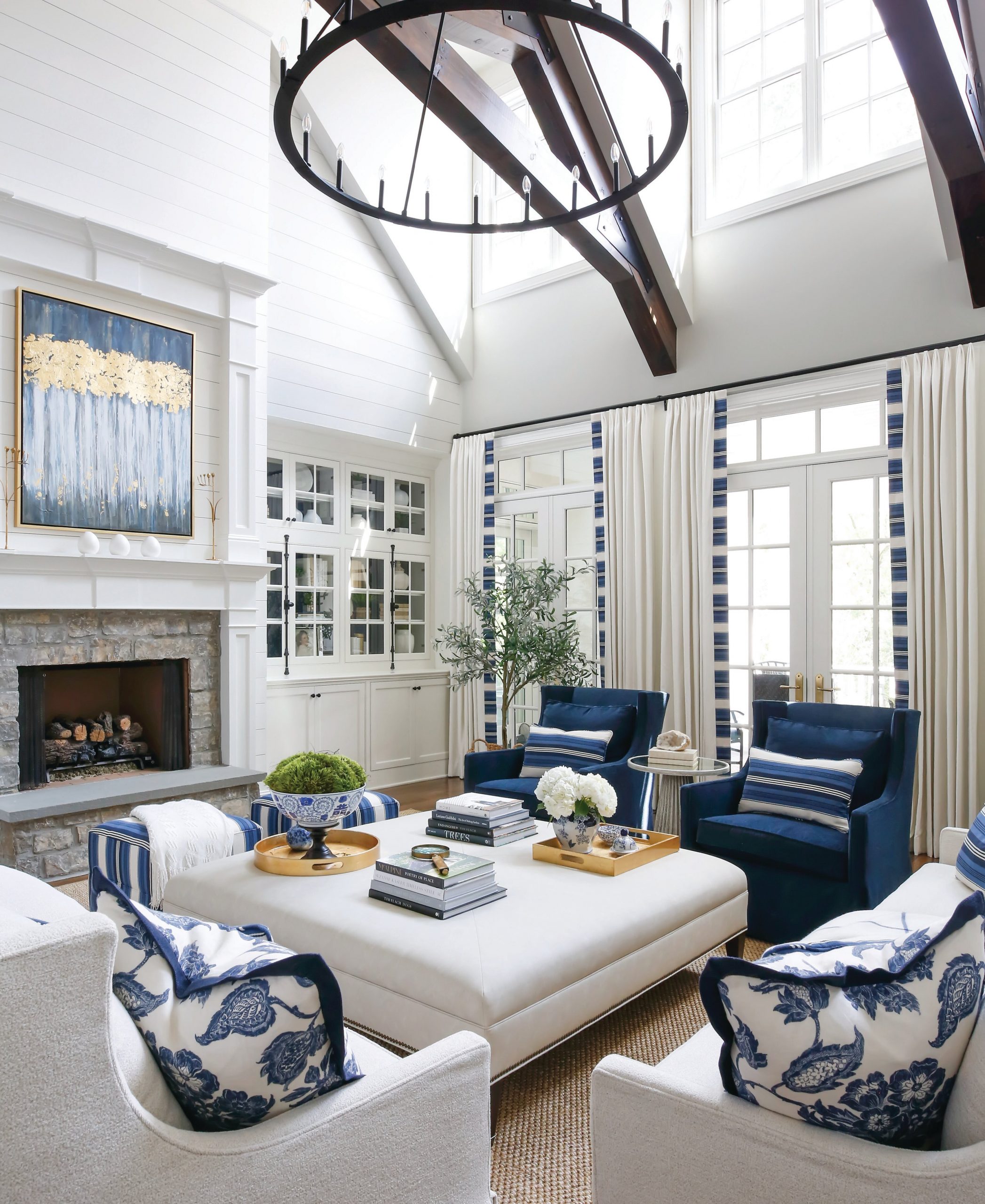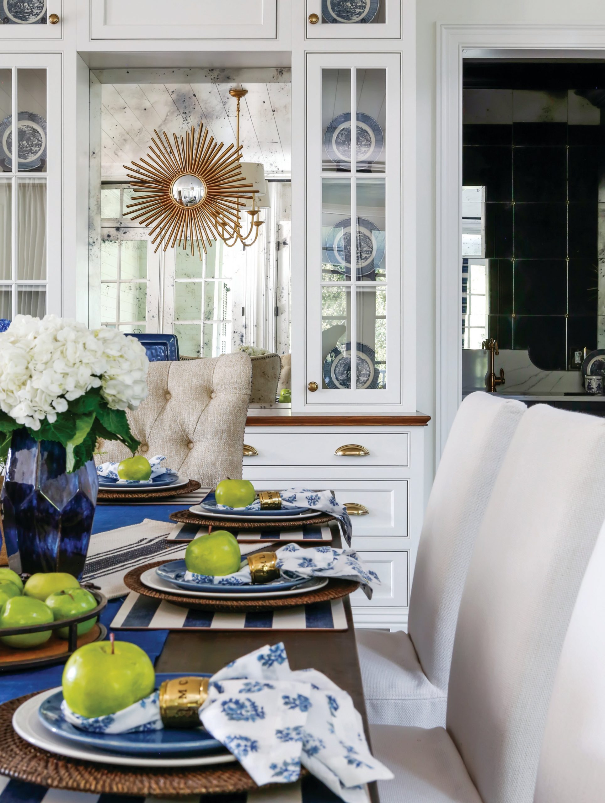 The open concept floor plan excludes a formal dining room but allows ample room for a large dining table, and three sets of French doors open to the covered porch, providing extra seating during larger gatherings. The designer made sure to use plenty of blue, the homeowner’s favorite color, and was able to mix a variety of shades and patterns. The upholstery used in the home is made up of performance fabrics that keep things functional, and a blend of textures give each room its own vibe. The everyday living space—including the master and a guest bedroom—is on the first floor, while three guest bedrooms and a media room are located on the second level.