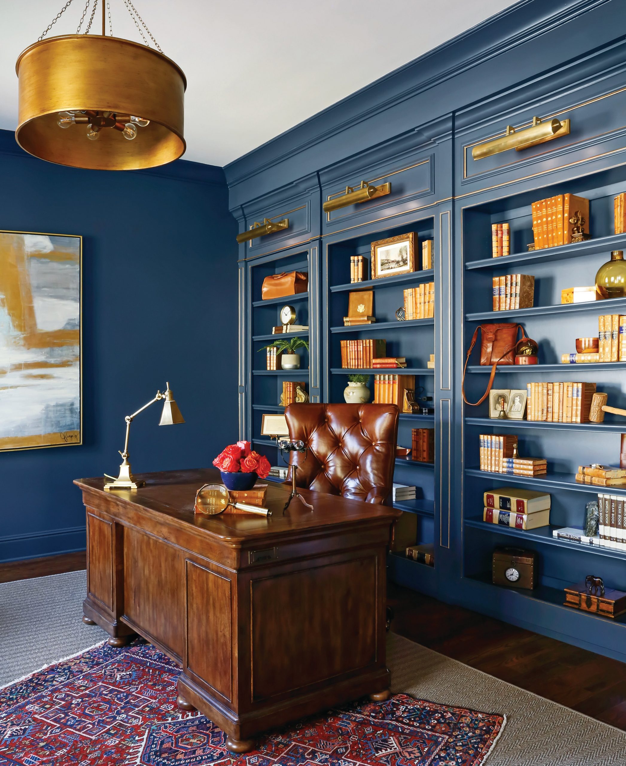 From a custom-designed garage and workshop to a spacious kitchen and well-equipped pantry, every detail on the homeowners’ wish list was taken into consideration. Sailer even designed a hidden bookcase in the study that leads to the master closet, allowing the homeowner to check in with work without having to walk through the home. “I love creating secret spaces whenever I have the opportunity,” she says. “My other favorite detail was designing a one-car garage for Phyllis that would give her easy access to drop off groceries in the kitchen.”