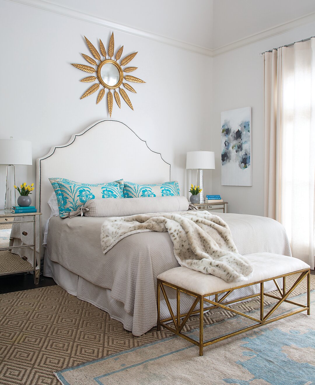 An airy, open kitchen with a breakfast nook was also a must for the Dennises. The children love to use the space for studying, eating, and chatting with each other, and the ample counterspace is ideal for preparing large meals. A relaxing master suite, complete with a pop of turquoise, was also requested. Flake used an Oushak rug layered over sisal, and a smaller but equally stunning sunburst mirror was installed over the upholstered headboard. The overall interior aesthetic of the home is kept serene, clean, and stylish with a chic exterior to match. “I encourage my clients to think outside the box so we can really bring the wow factor, and I think we definitely accomplished that with this project,” says Flake.