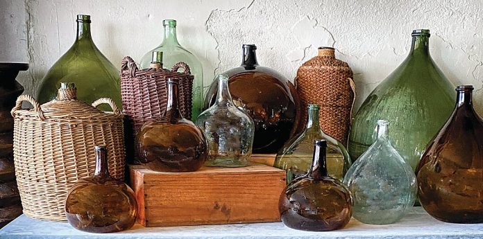 Of all the decorative arts, perhaps none has had as much difficulty surviving the centuries as objects made of glass. Whether an ancient Greek bowl or Georgian-era stemware, antique glass is a rare commodity today because of its delicate nature and its susceptibility to breakage, especially when handled by clumsy hands. But there is one type of glass object whose design more or less ensured safe passage through time: the demijohn, a voluminous glass bottle, originally wrapped in wicker, whose curious name is as intriguing as its rotund shape.