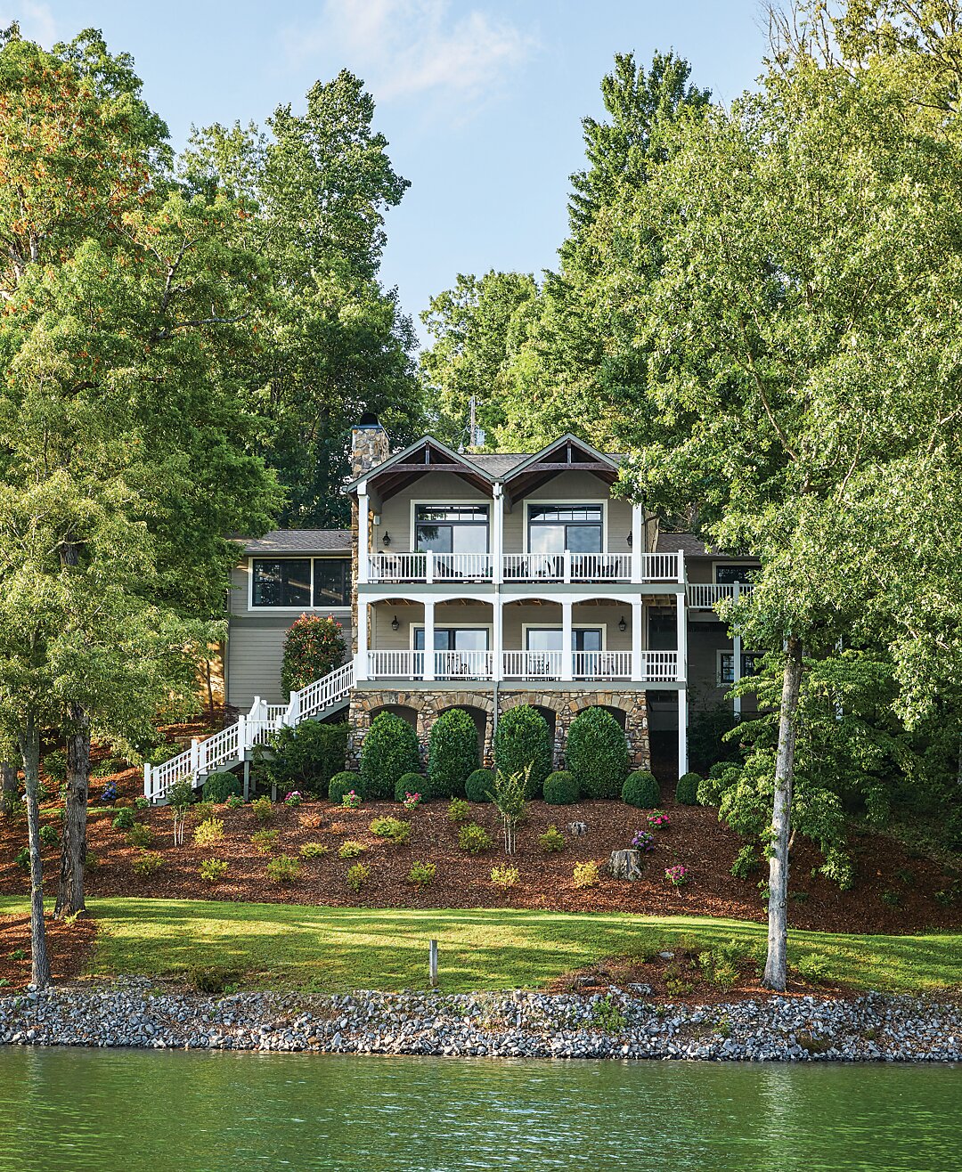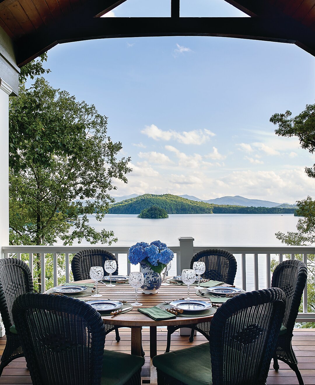 With three levels of outdoor space to consider, Greeley replaced the old decking with Brazilian walnut and added new railings and the stone pillars that ground the structure on the lakefront. She set about creating multiple areas for gathering both in large groups for dinners and cocktails and for coffee à deux on a quiet morning. “Our favorite spot is the small deck outside our bedroom,” says Greeley. “In the afternoon, Wells loves to have a drink at the bar table, put his feet up on the railing, and just enjoy the view.” The Greeleys’ reborn lake house is designed for enjoying every little moment, for years to come.