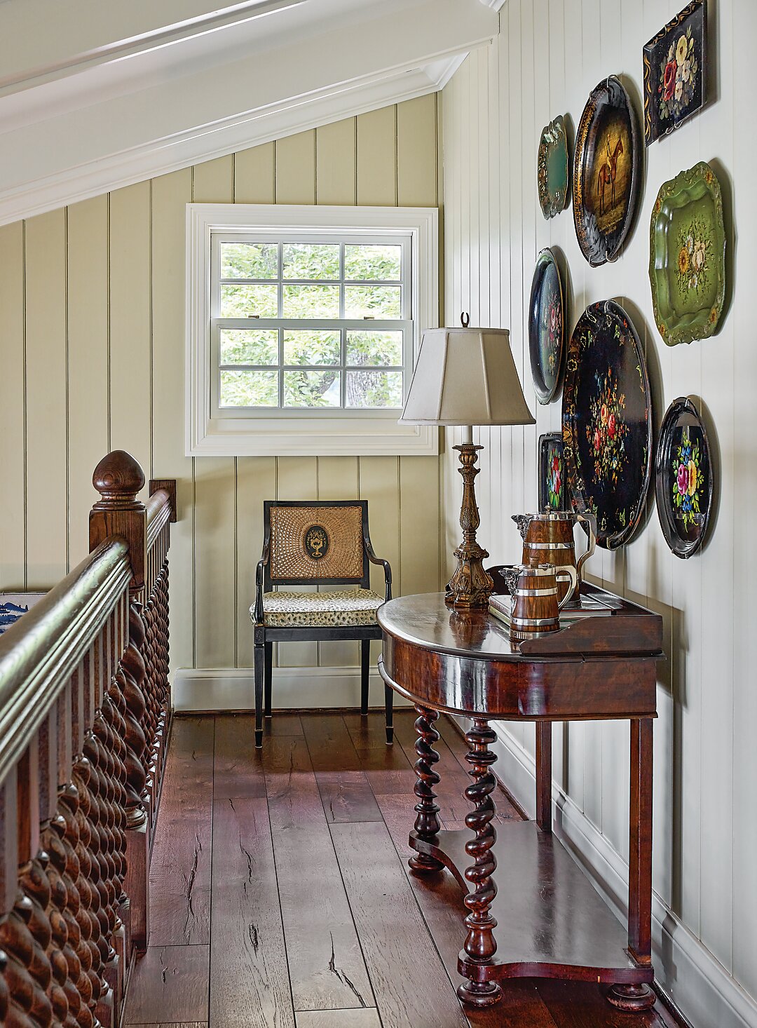 Over the years, Greeley had bought antiques for the lake house, shopping everywhere from Palm Beach to Boston, including many North Carolina sources in High Point and Cashiers. Her store in Hayesville, Molly & Me, provided an outlet for extras. It is, however, her collections that give the house a strong English point of view. Majolica, blue-and-white porcelain, creamware, jasperware, and tole trays all have places of prominence in the design. “Everywhere I travel, I find pieces to add to my collections,” she says.