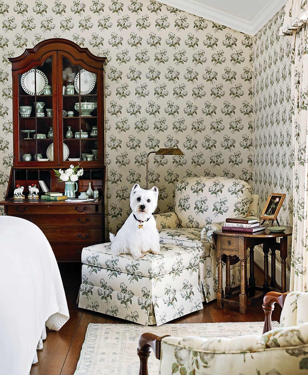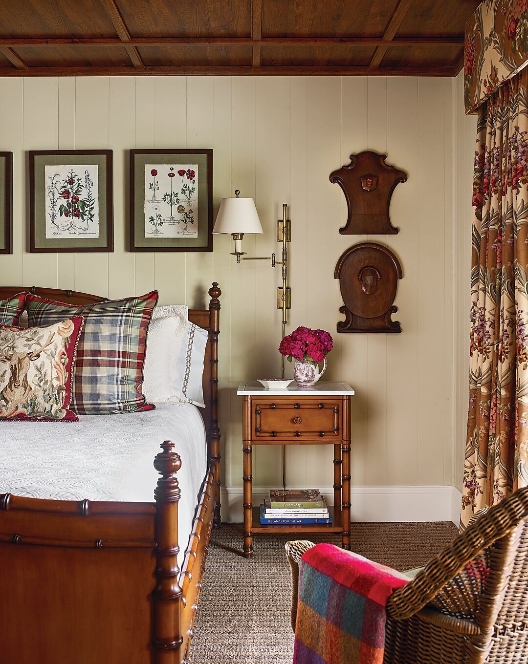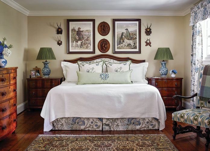 With views of the lake and woods such a strong aspect of the house, Greeley took inspiration from their hues for her palette. “I took the blues and greens of the scenery, which also happen to be my favorite color combination, to connect the interiors to the surroundings,” she says. Throughout the house, timeless fabrics from legacy lines such as Colefax and Fowler and Lee Jofa lend a sense of permanence. The master bedroom is upholstered, walls included, in Colefax and Fowler’s iconic Bowood. The living room’s tartan upholstery is a classic Ralph Lauren design. “You don’t see those much anymore,” says Greeley. A notable painting of a Scottish gentleman hangs over the living room mantel, his tartans reflecting the room’s textiles. Greeley had admired a similar painting in a bar in Scotland and had a local artist in Raleigh recreate it for the lake house.