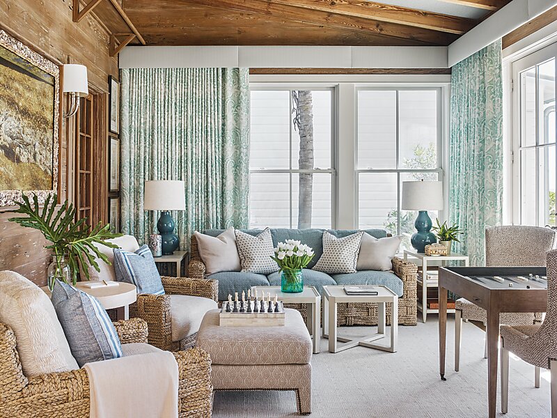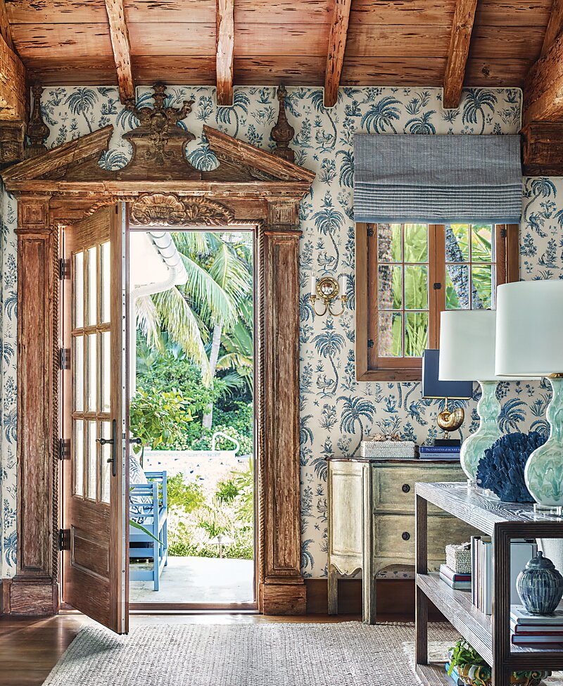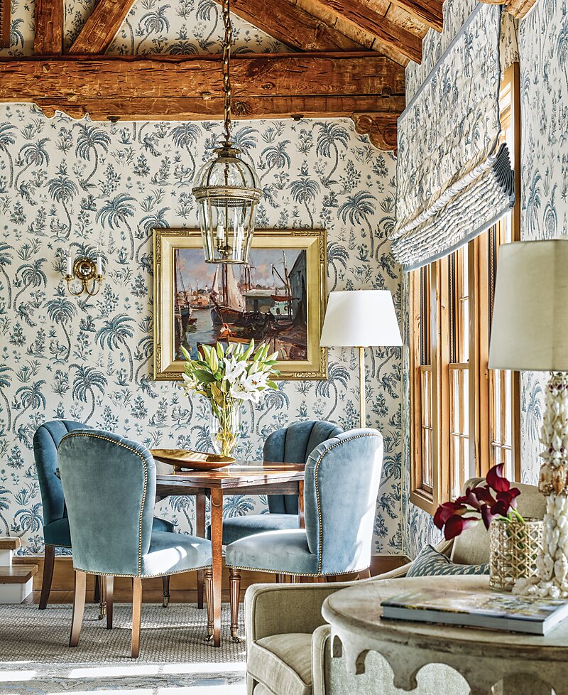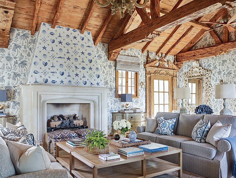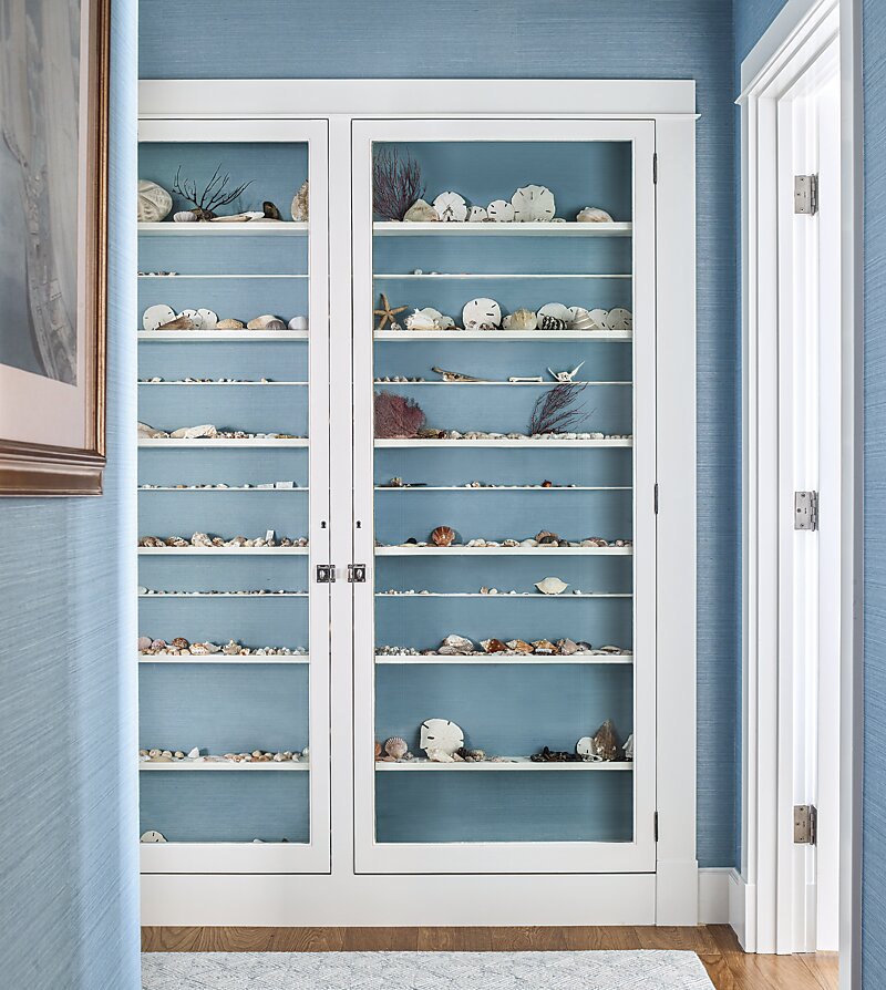 The house did offer up a couple of silver linings, including a paneled antique living room that the former owners had brought over from Europe. This architectural gem still needed a face-lift. “The ceiling was just too dark for the type of beach house my clients were envisioning, so it was lightened up with a limewash technique,” says Kendall. To protect the integrity and beauty of the stained wood walls from damage, the clever solution involved upholstering the walls with a light padded backing. A built-in glass-front cabinet that the previous owners used to display their collection of shells—which, to the delight of Kendall’s clients, came with the house—needed updating as well. The designer reworked the cabinet by wallpapering the back of the shelves in the same pattern as the surrounding walls, giving it a more seamless appearance.