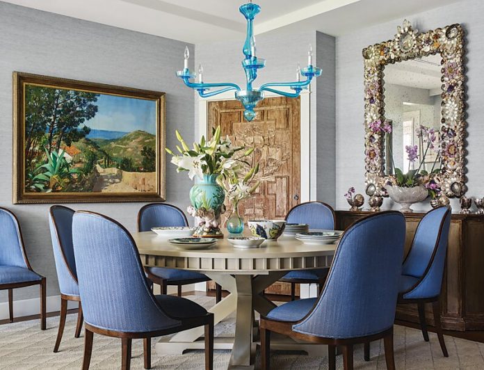 A range of antiques, many sourced abroad, speak to a studied, not stuffy elegance. Showstopping shell mirrors in the living and dining rooms and main bedroom, a patinaed English console, and a lamp made from a Parisian antique fragment, all add authenticity and style. Along with the antiques, Kendall also commissioned pieces from many sources, such as the bedside chest in one of the children’s rooms by London-based firm Justin Van Breda, custom wall sconces from Urban Electric, and a Holland MacRae reproduction game table made in an Old English style. Low ceiling heights in most of the rooms proved challenging. To give the impression of height, Kendall hung window treatments in the highest place possible and used interesting light fixtures, such as the blue Murano chandelier in the dining room, to draw the eye up.