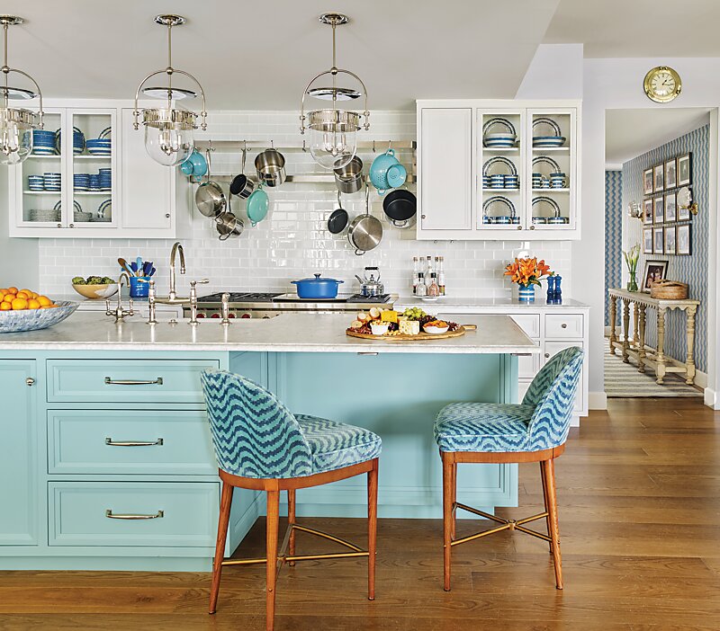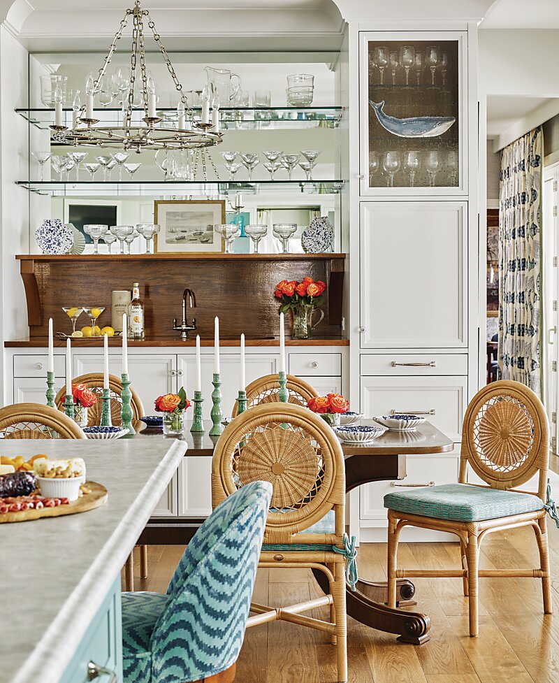 A symphony of blue-and-white links elements both new and old to impart the fresh attitude the clients desired. “It is blue-and-white to the nines,” says the designer. “But the range of blues used throughout keeps it dynamic, as do all the varying prints.” Kendall executed the color duo with great panache throughout with a generous use of wallpaper; striped, floral, and botanical fabrics for upholstered headboards and dining room chairs; and tile in a bathroom. The revamped kitchen shows off a brighter hue with its painted island and upholstered bar chairs. One striking use of blue occurs in the family room—the custom builtins and walls are covered in a bold lacquered wallpaper. In some spaces, such as the sunroom, blue is more of a supporting player, letting the ocean views take a starring role. After all, the location was always the main attraction.