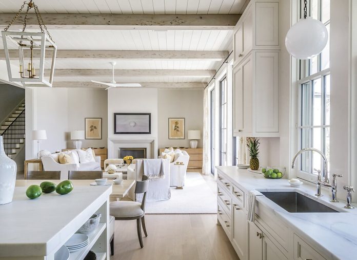 For her part, architect Julia Sanford strove to give them timeless spaces filled with light. With seven bedrooms and ten baths, there’s a lot going on inside the walls. “We worked hard to make the roofline complex to mitigate the size of the house,” she says. “Dormers and windows break up the mass of the roof into a more human scale.” Inside, she employed textures to warm the rooms. Shiplap paneling, limewashed cypress beams, plasterwork, softly hued marble, and a pair of antique French doors add dimension and interest on walls and ceilings.