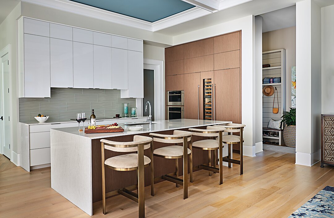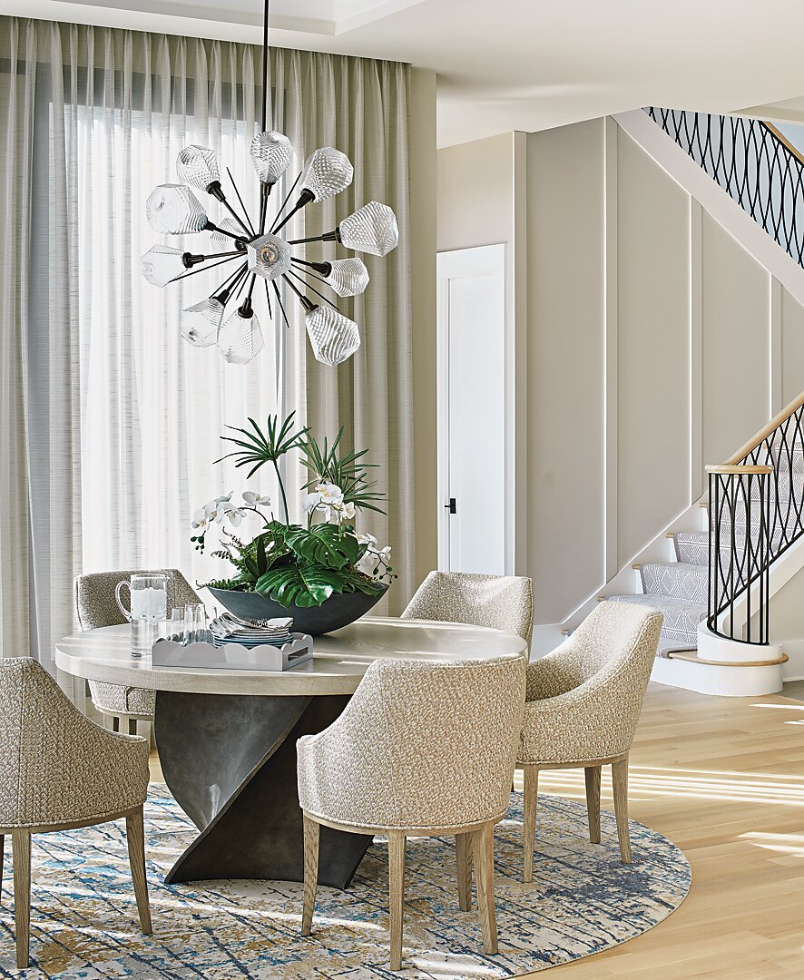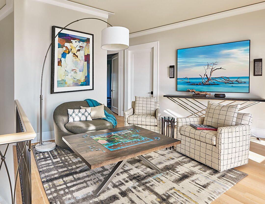 Indoors, a casual, contemporary aesthetic with very subtle touches of coastal influence emerged. Neutral colors on the walls, cabinetry, and upholstered goods set this tone and allowed for the brighter accents the owners desired to be brought in through custom rugs, artwork, and accessories—all of which help to personalize the home. Additionally, the tray ceilings in the kitchen and living and dining rooms are united by a shared blue hue that brings a subtle dose of color. “There’s a calming elegance about this house. When you look at a room, I don’t know that you would think it’s coastal; it’s just a beautiful, peaceful space,” Williams says.