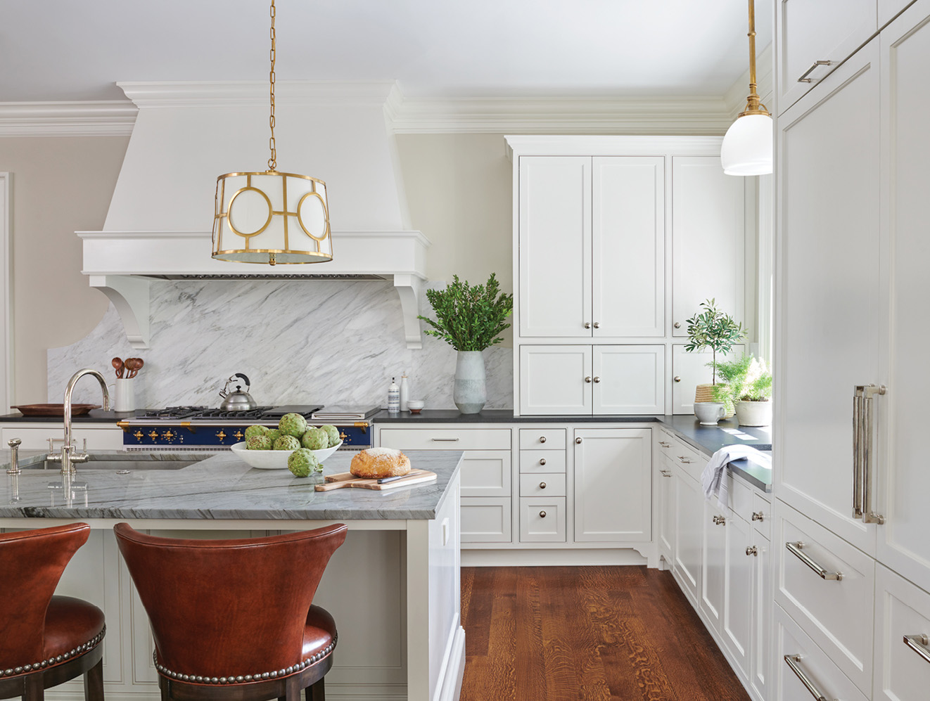 Morris highlighted these impressive architectural moments by painting the millwork and built-ins to the match the walls—soft white in the entry and living room, satiny slate in the study, and high-gloss peacock blue in the scullery. According to the designer, this trick of the trade is not only used to showcase the exquisite embellishments but also to keep the eye roving around the room to absorb every inch of splendor. Washed Oushak rugs, luxe upholstery, and tone-on-tone wallcoverings enrich the predominantly neutral palette by heightening tactile interest while pops of brilliant blue from the grand Lacanche range, custom painted sideboard, and breakfast room chairs impart an exciting visual contrast. Unlacquered brass hardware, gold leaf accents, and lighting radiate warmth amid the otherwise chilly color scheme and glisten in the natural light that floods through expansive banks of windows and the glass conservatory.