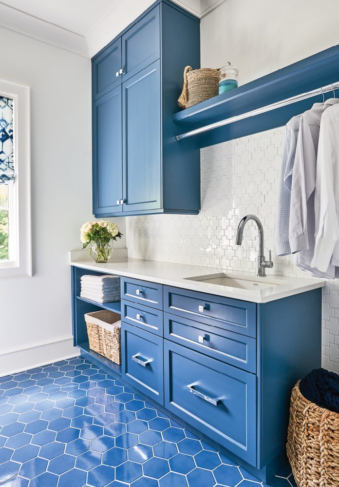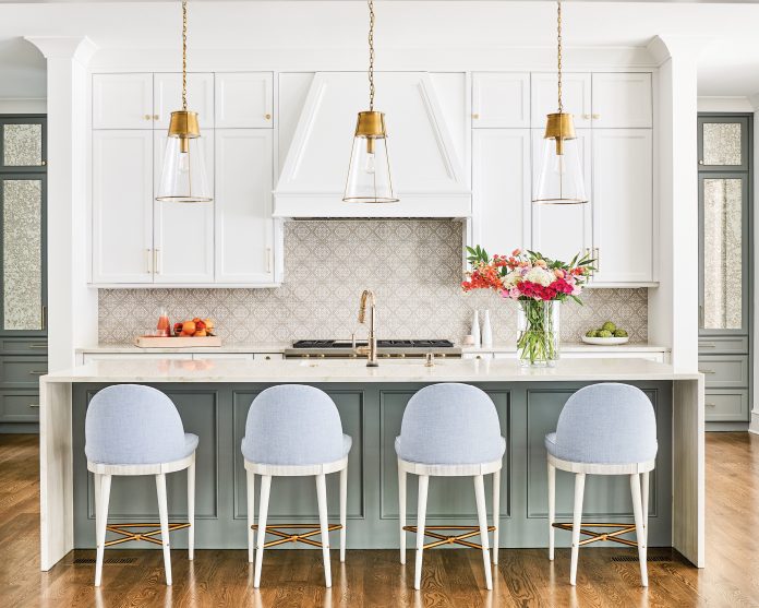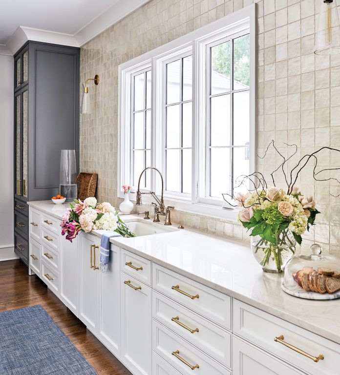 Poised on a tree-lined street in the posh Foxcroft neighborhood of Charlotte, North Carolina, this stately home stands proudly on top of a lush green hill. At first glance, the gracious 8,000-square-foot property emanates a sense of Colonial grandeur from its well-appointed architectural presence. But a closer look at the entrance reveals a pair of striking blue doors that pop against pristine white brick—a modern touch that sets the tone for what is to unfold when one steps inside. Swathed in white, a crisp and airy interior palette comes to life in a multitude of cool blues accented with hints of coral and lilac. Updated traditional patterns, textures, metal finishes, and materials sprinkled throughout culminate to create a warm Southern welcome. The light-filled home breathes a fresh aesthetic suitable for a modern family—a feel strategically crafted via the creative nuances of designer Layton Campbell and Louise Leeke of Kingswood Custom Homes. Leeke designed the kitchen and bath areas and also selected the lighting fixtures and paint colors.