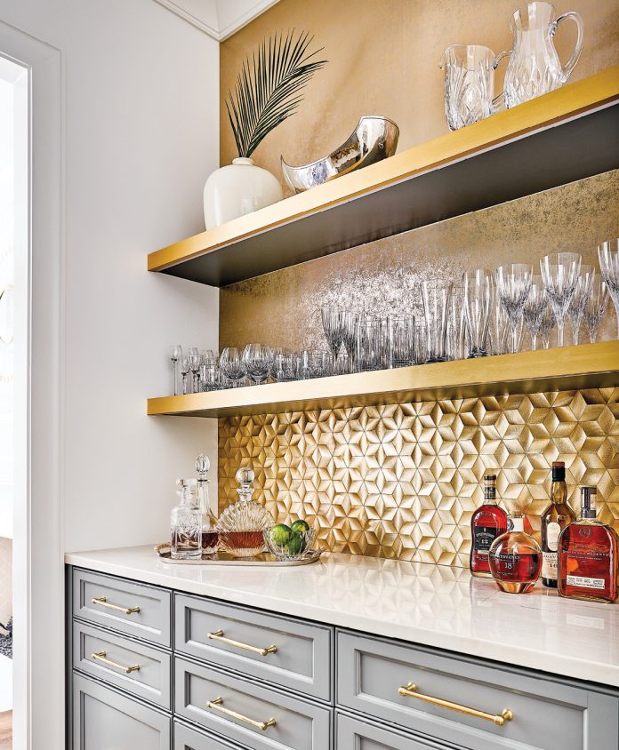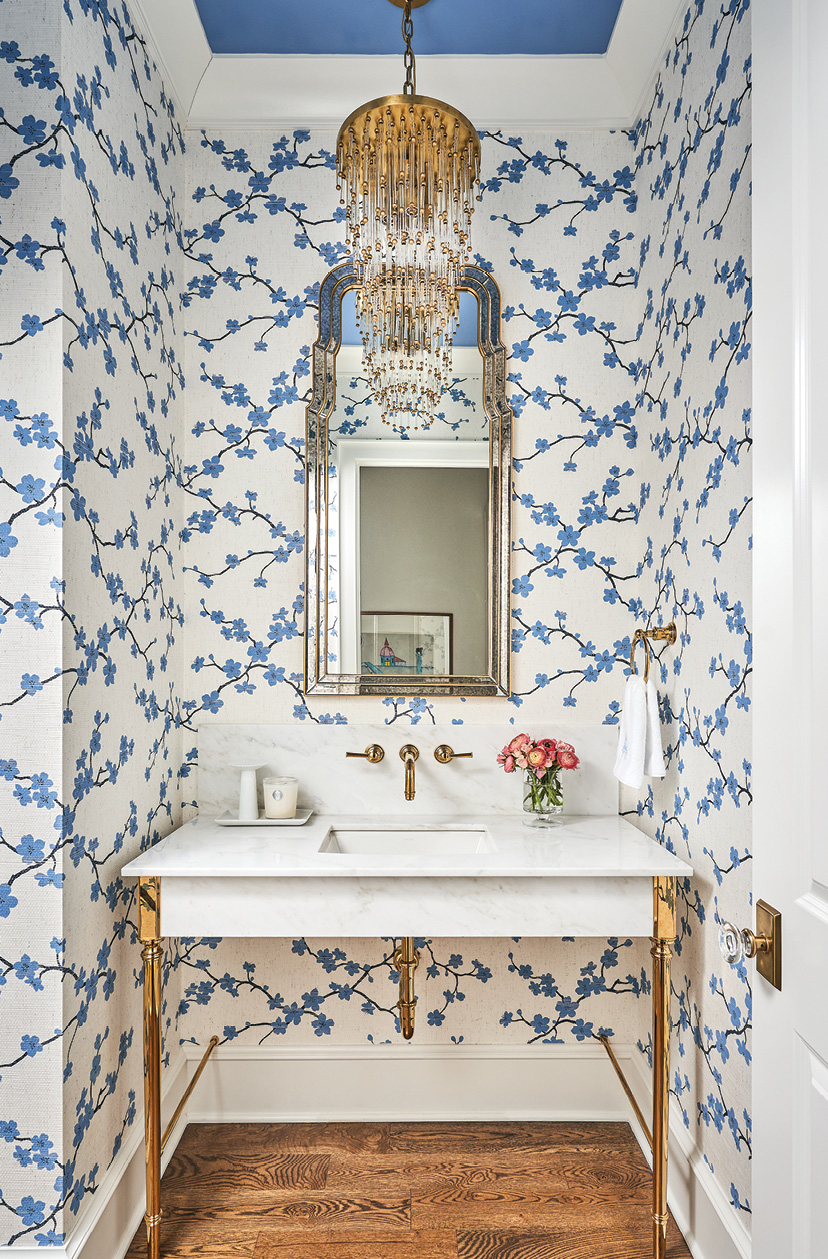 The designer added elegant but lively textural wallcoverings, from a Phillip Jeffries blue silk in the living room to a Thibaut dogwood blue-and-white grasscloth in the powder room. He continued the theme, applying an abstract blue-and-white textured wallpaper in the dining room to give it a more approachable feel. He implemented a Phillip Jeffries gilded mirror wallcovering in the bar above the shelves to echo the gold-themed metallic tiles below them and create a beautiful reflection in the space. “Reflection of all the sunlight-filled spaces was important for me to capture,” notes Campbell. “I used a wool and silk hand-knotted rug from Stark in the living room that the sun dances about throughout the day, and in the evening, it shimmers in the lamplight.”