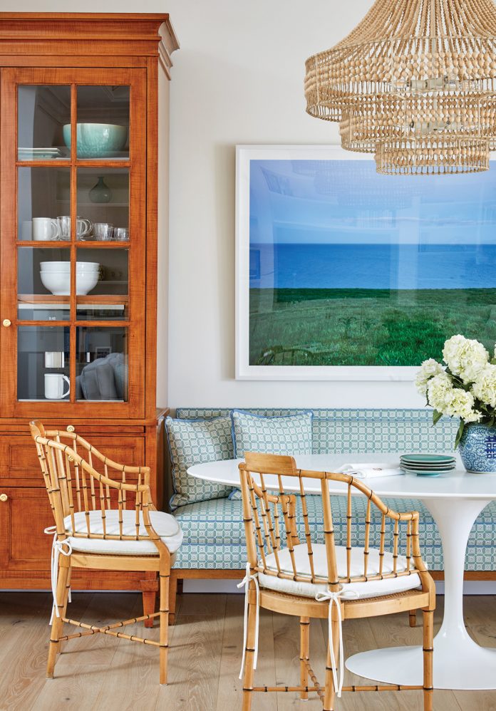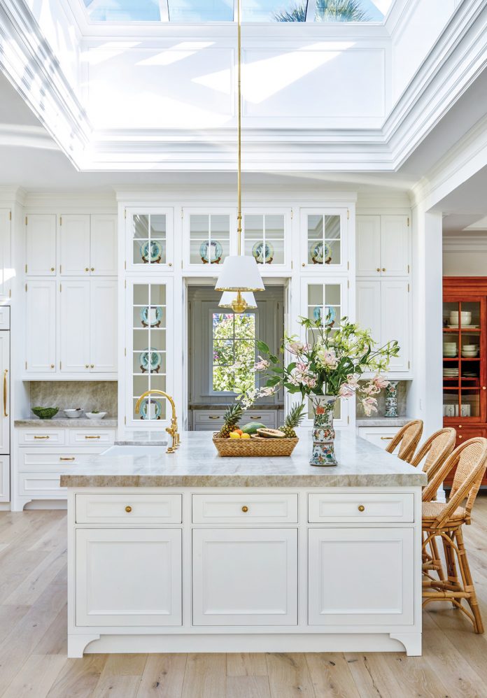 To bring natural light into the kitchen, the owners requested a laylight above the island. “This allows light to pour into the kitchen, which is the center of the home,” adds Stokes. A La Cornue range with a custom hood and Taj Mahal quartzite set the stage for a classic cook’s station, while a custom banquette with vintage chairs establishes a favorite place to hang out.