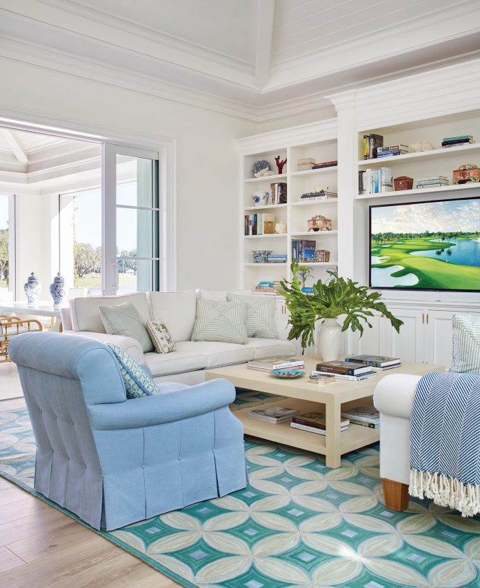 “The owner has a love of blues, particularly periwinkle, and greens, which are common color schemes throughout the home,” says Stokes, especially in the dynamic study. “We always wanted this room to be more dramatic,” the designer adds. The deep turquoise wallpaper and the soft green sofa fabric reflect the casual comfort of the Vero Beach retreat.