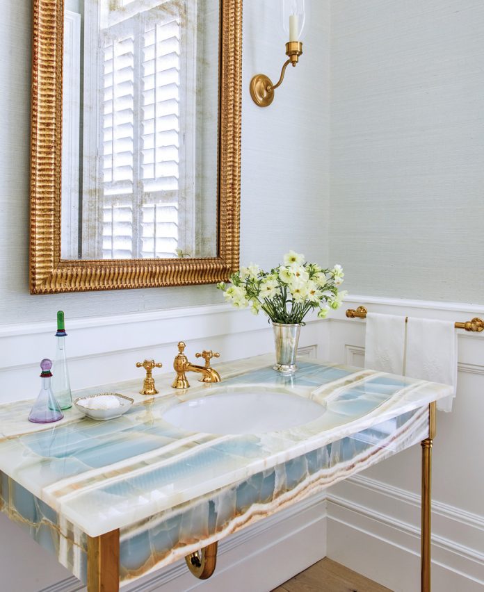 While the home in general is not an open plan, the living room and dining room are connected to establish a large gathering space for family and friends. Durable indoor/outdoor fabrics on the white sofas and chairs were a must, while the owners’ existing art collection influenced some of the color selections. “We knew the owners’ art would be part of the design,” Stokes says. “We kept it in mind when selecting fabrics and paint colors.”