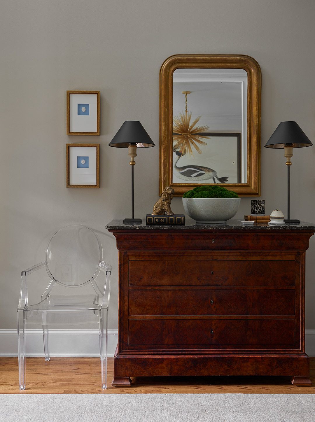 Aesthetically the clients wanted it to feel like a layered, designer, adult home and had come with few treasured items, with the exception of their china. Part of the fun for Dunning and Gordon was trying to find the just right vintage and antique pieces that, hopefully, would be passed along for generations to come. Some of these pieces include a beautiful antique French chest procured from Huff Harrington, a print from Nostalgia Fine Art, and bamboo chairs sourced from Scott Antique Markets and recovered in a deep rust mohair.