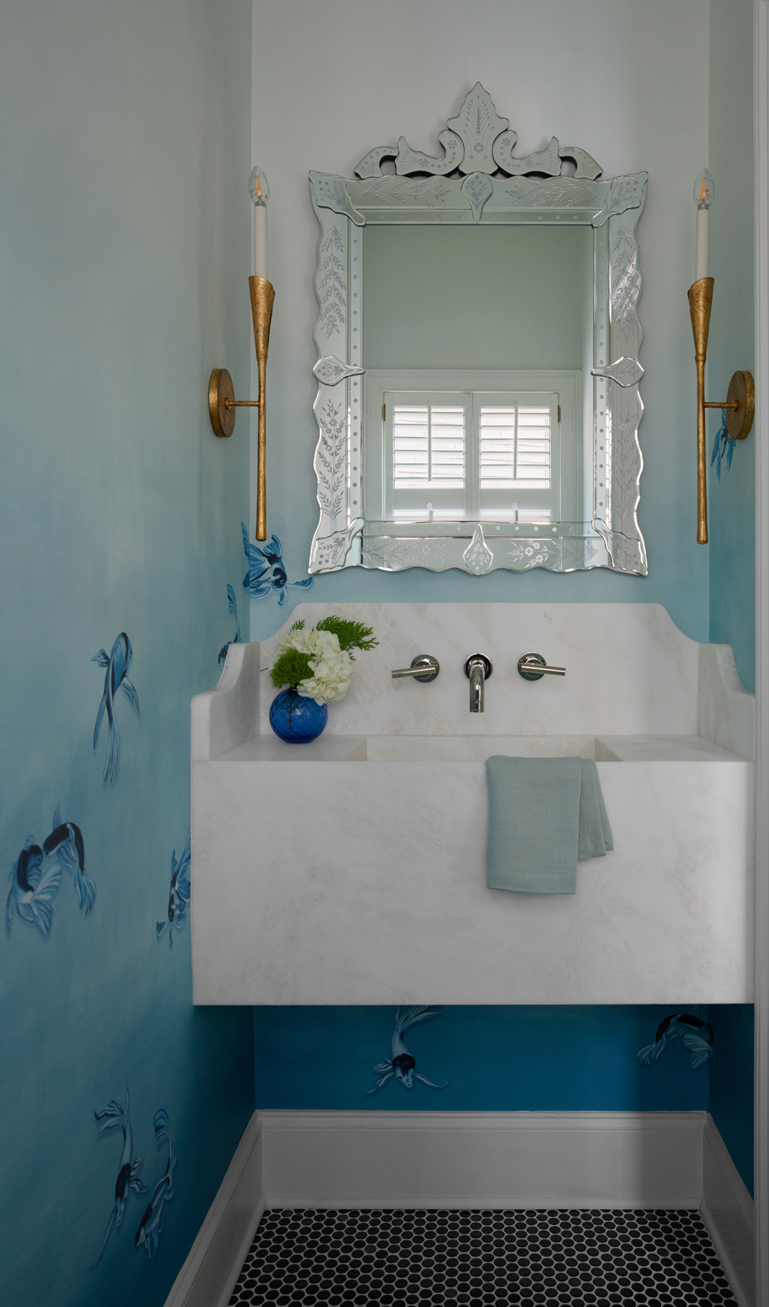 For the primary bath, the designers created a wet room, eliminating a very strange layout with a corner tub and tiny shower. They brought in a sleek tub and a much larger shower, taking the glass to the ceiling to keep the warmth. In the powder room, they made use of the teeny space with a floating marble sink and a fabulous Ann Jackson blue fish wallpaper.