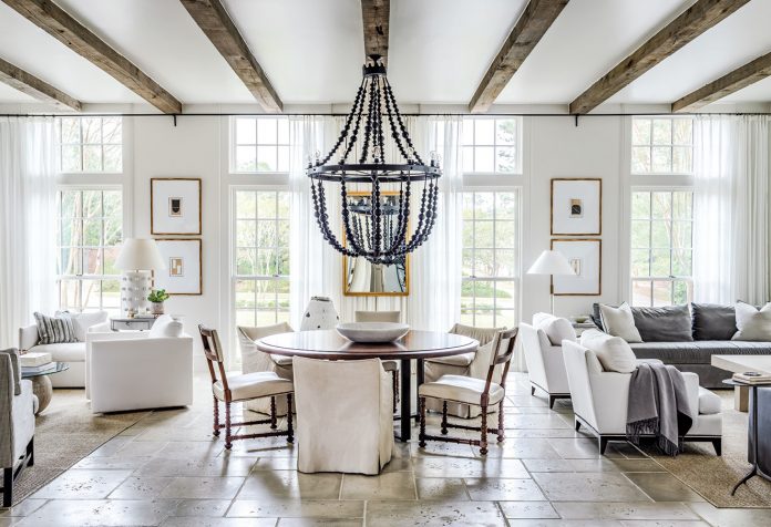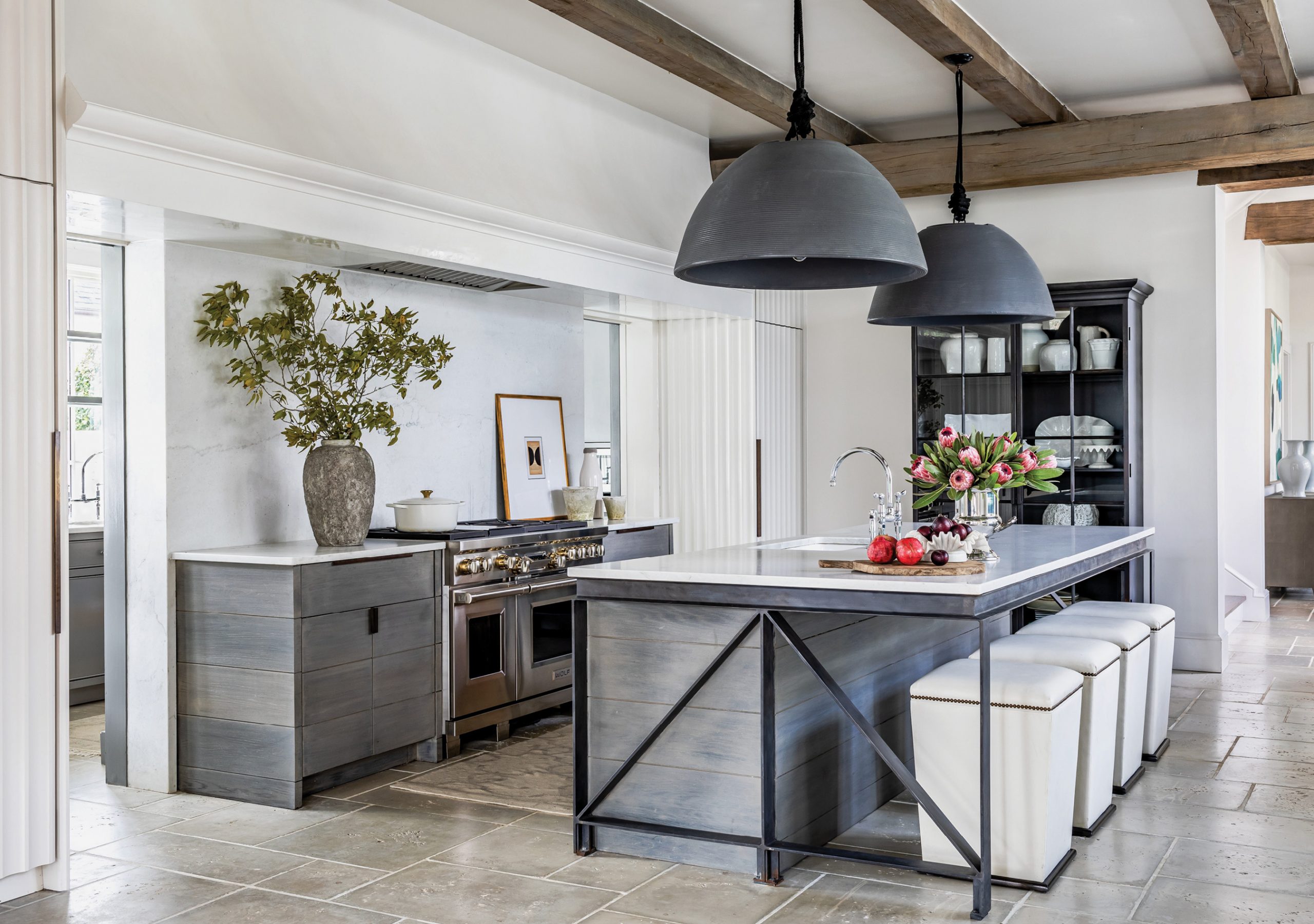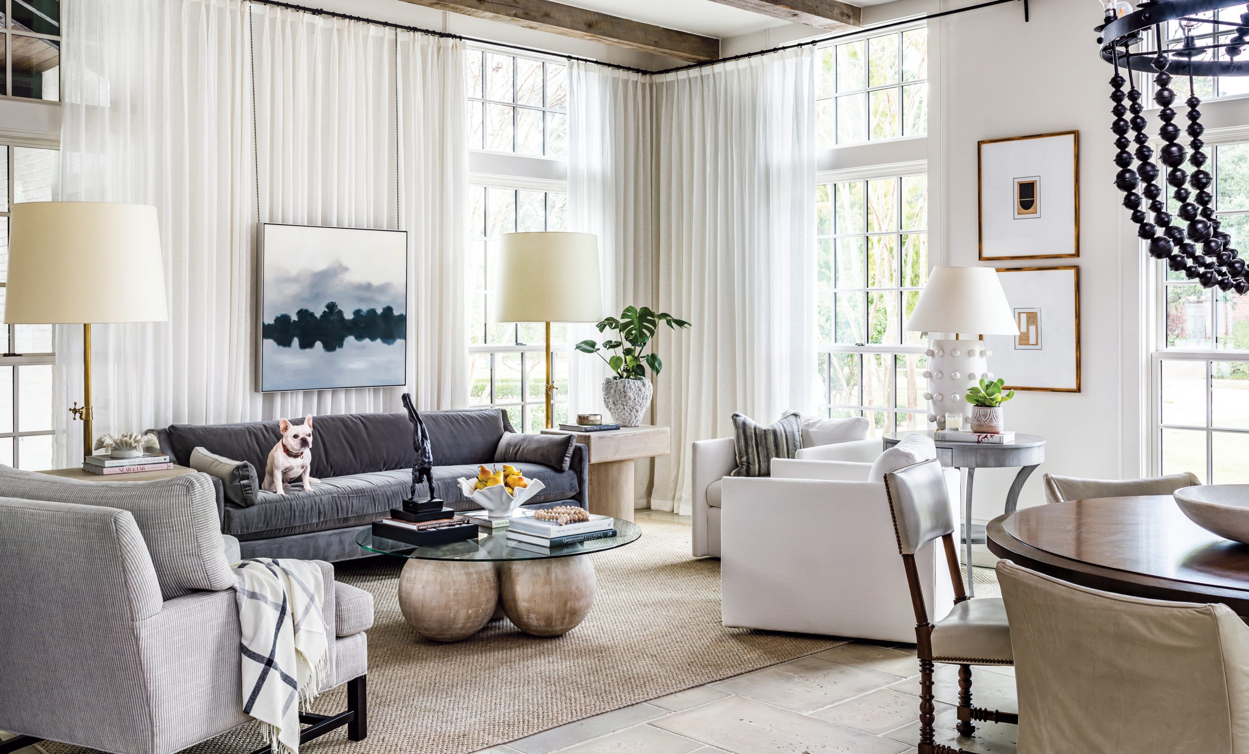 Using rugs, seating, and sculptural elements, Gilbreath successfully carved the large area into distinct spaces, each with their own individual purpose. Floor-to-ceiling windows let in an abundance of cheerful light, while regionally reclaimed wooden beams add character to the 11-foot ceilings. Gilbreath’s team chose pretty but hardworking fabrics for the living areas to stand up to the use of the family’s three children and two dogs. “They love to do movie nights,” Gilbreath says. “So the living room is very cozy and centered around being able to hang out together around the fireplace or the TV.”