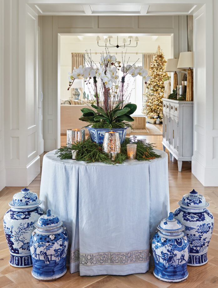 Throughout the 6,200-square-foot home, a clean palette of white and neutral walls gets a dose of warmth and texture from the intricate trim and millwork complementing every room. The Kellers’ decision for a subtly beautiful architectural design and color scheme was intentional as it provided an ideal backdrop for year-round interiors—especially Christmas décor.
