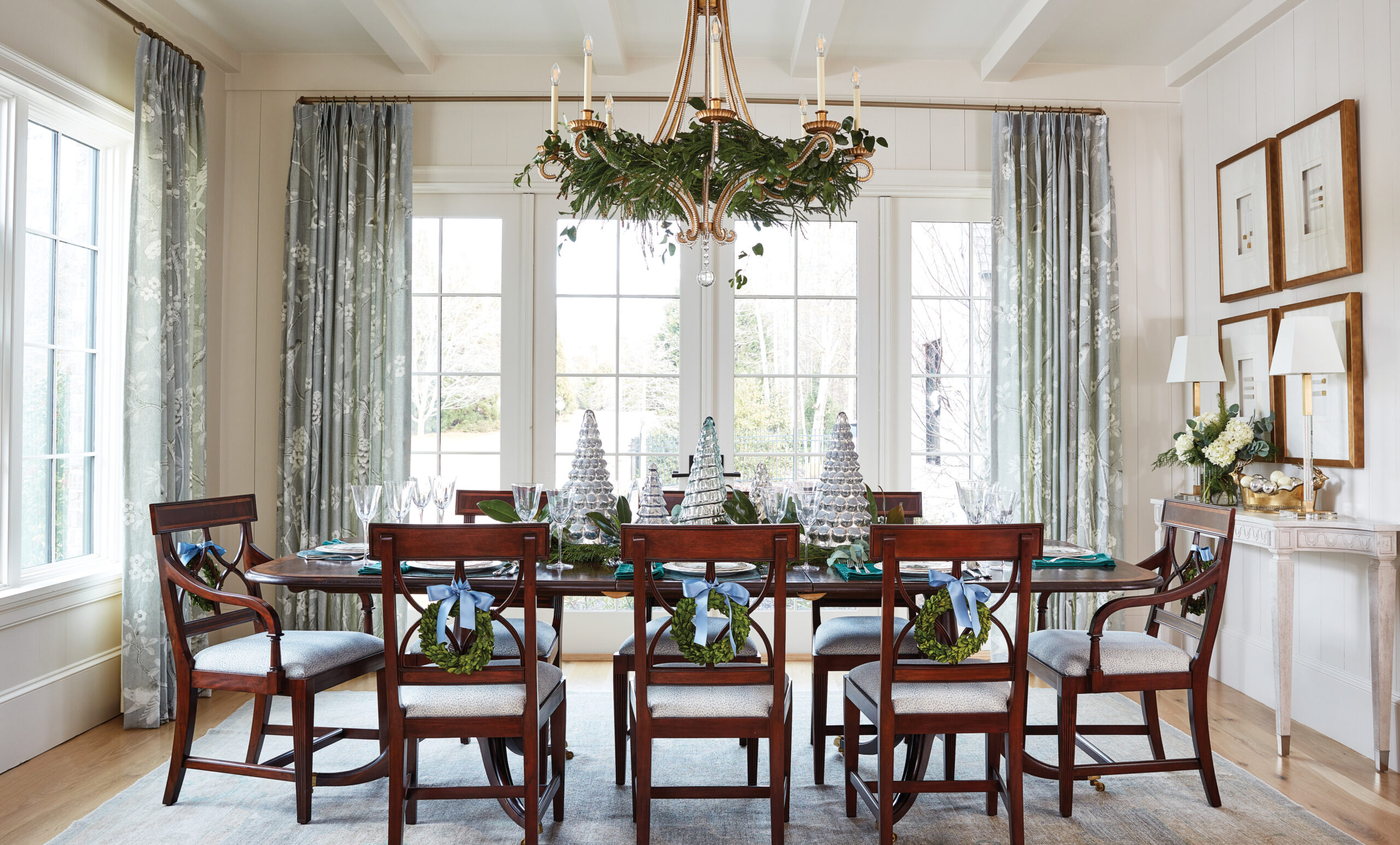 “A well-dressed table is an essential part of holiday entertaining in the South,” says Brackman, “and the Kellers wanted a special place to share a meal and gather with friends and loved ones. So we chose a graceful tree pattern from Arte Italica for the table settings and built the color scheme around it. The deep jade placemats might be my favorite item on the table.”