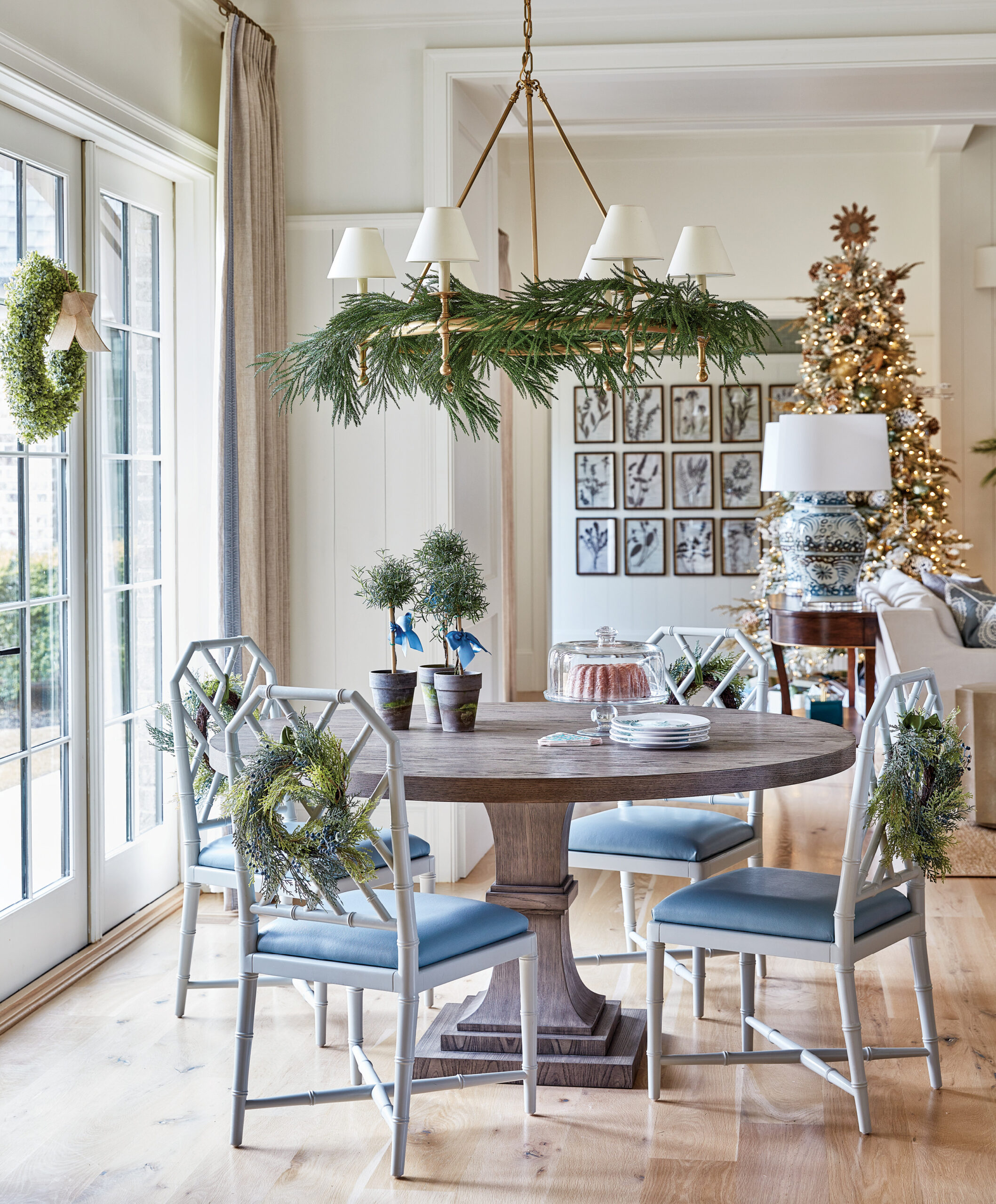 The family room tree takes on a more formal design with a shimmering mix of metals as the focal point. A massing of mercury glass ornaments of all shades and shapes covers the branches, and delicate gold and silver trinkets lend accents in whimsical and traditional styles. A gorgeous blue velvet ribbon delivers the finishing touch. “In true Southern tradition, I used layers and layers of fresh greenery to ground all the Christmas décor,” says Brackman. “There is nothing more beautiful than a healthy mixture of cedar, cypress, eucalyptus, magnolia, and smilax on tabletops, chandeliers, and wreaths.”
