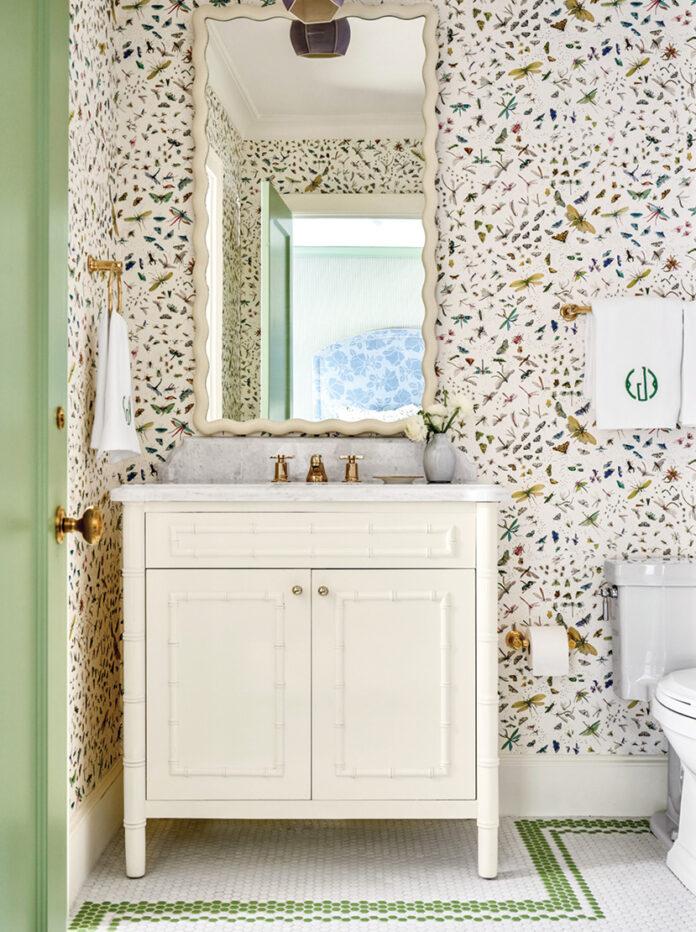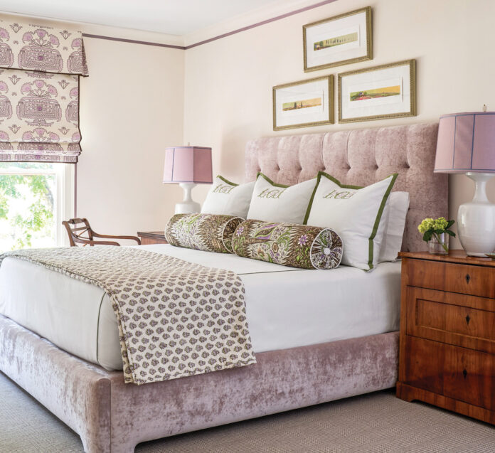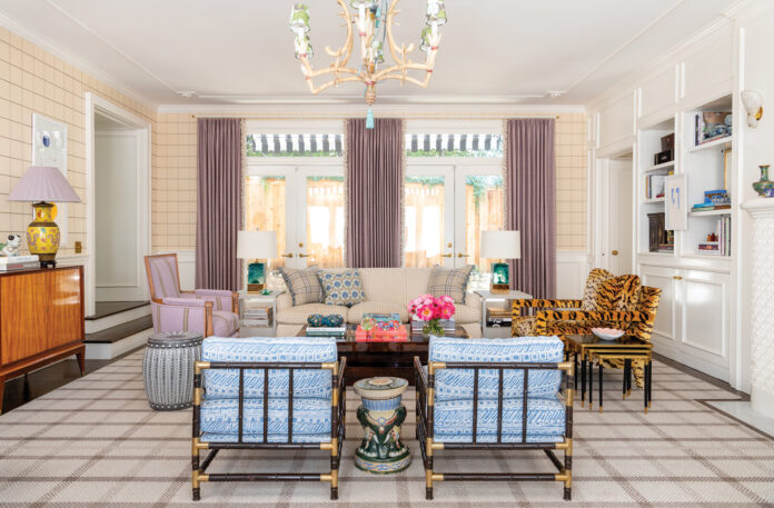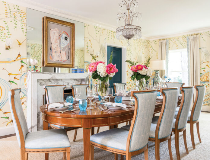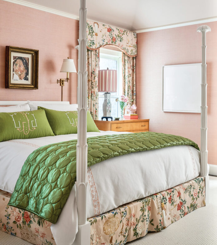 Two living rooms gave Jenkins the chance to create different moods in each space, with a formal room that could be at home in New York’s Upper East Side and the other imbued with a preppy, Palm Beach style. Throughout the house, shades of pink animate rooms of broad blue and green palettes. The primary bedroom is swathed in a rosy grasscloth with leaf-green accents and chintz window treatments. “We have to choose our words very carefully when presenting this color to husbands,” she says with a laugh. “We call it ‘salmon.’ My husband loves the color.”