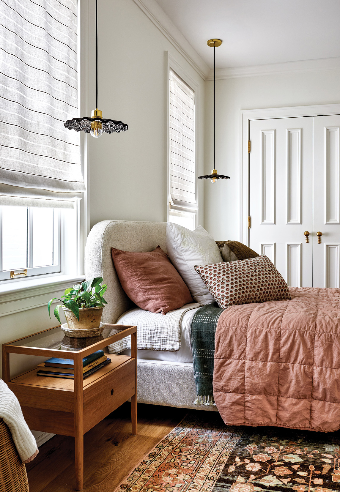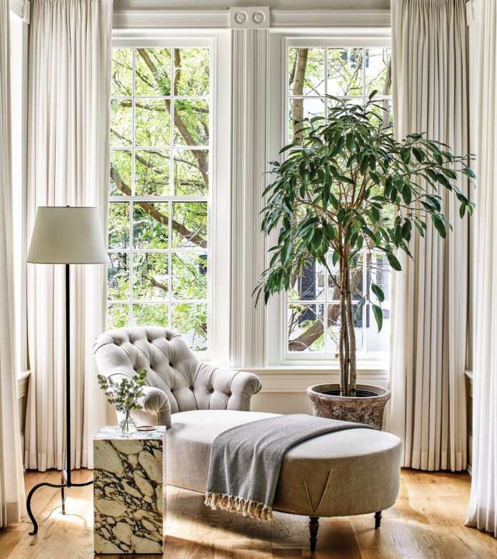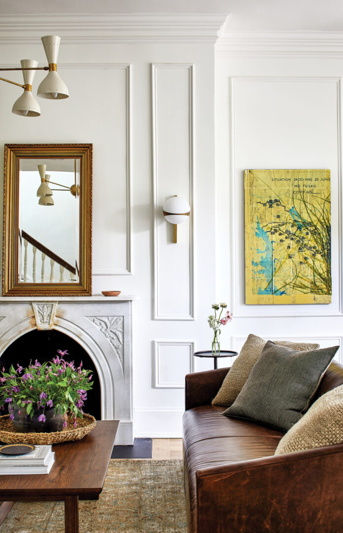 With a new kitchen in place, an open and structurally sound living space, and en suite bathrooms for every bedroom, among many other changes, the designer was finally able to focus on the interior details of the home. Swabb’s design approach for her clients and for her own home is simple: “I want a home to speak to me. The style of this house is Victorian, so we wanted it to have proper applied molding and crown molding and a sense of gravitas to it. That may not be my particular aesthetic, but that’s what the home called for, so that’s what we did.” Tiny details mattered: Every register was a replica of the home’s original diamond pattern. “Having those registers custom designed to match was a small way that we let the home speak to us and dictate how the design should look on the interior,” she says. A slim chair rail was added in the dining room because “I love the idea of this clean line allowing the dining room to feel like its own separate space.” Though the original floors could not be salvaged, Swabb chose a character-grade white oak. “I liked the knottiness and rustic element of this wood. It’s a beautiful backdrop for the rest of the home’s design.”